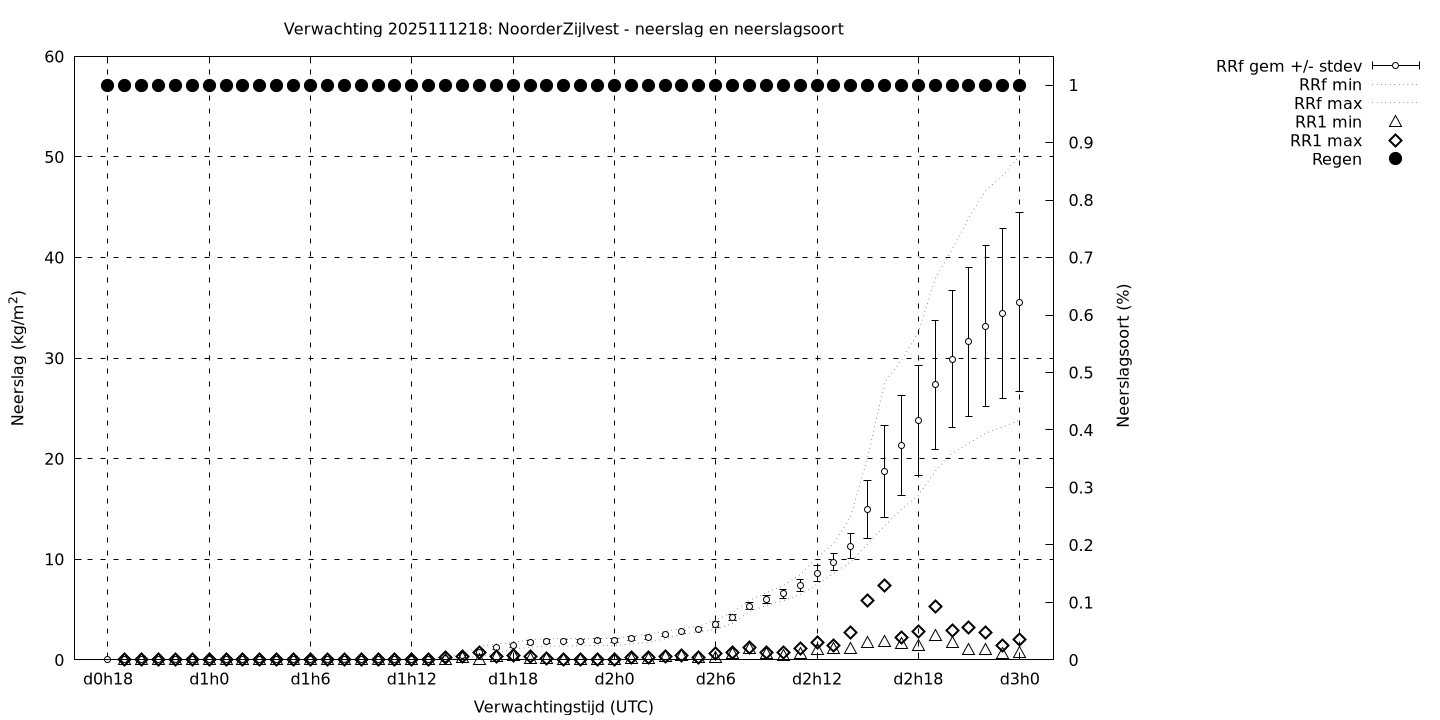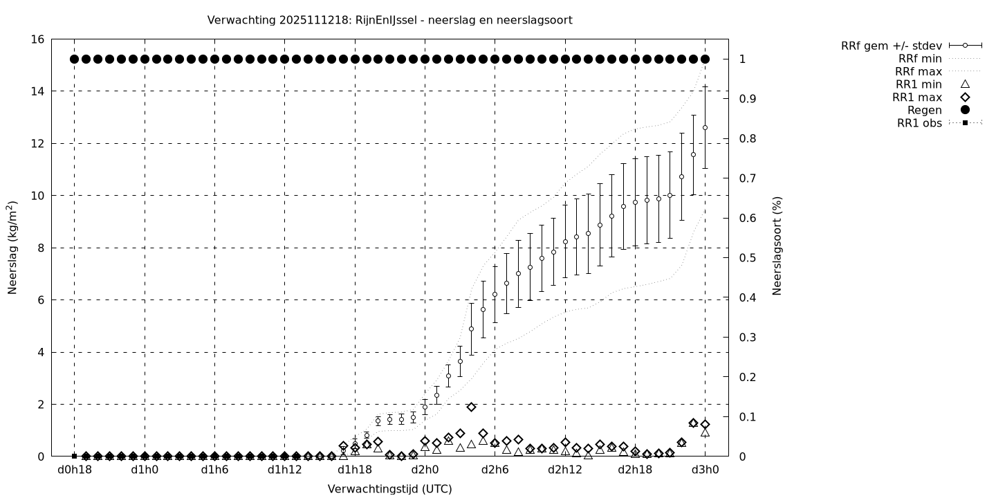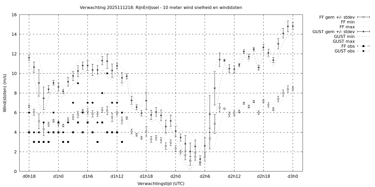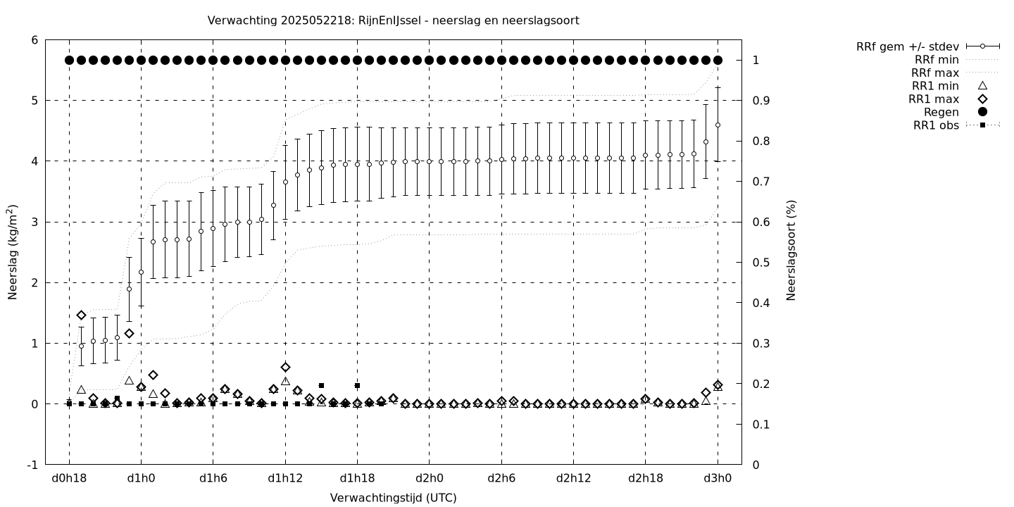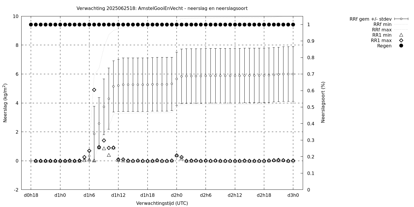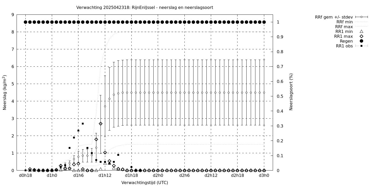 Tenslotte volgen grafieken van weersverwachtingen per locatie/waterschap, die gegoten zijn in de vorm van een tijdreeks, waarin niet alleen het gebiedsgemiddelde, maar ook de spreiding (via de standaarddeviatie) en het maximum en minimum gegeven worden. Tevens zijn de tabellen van de bijbehorende getallen gegeven.