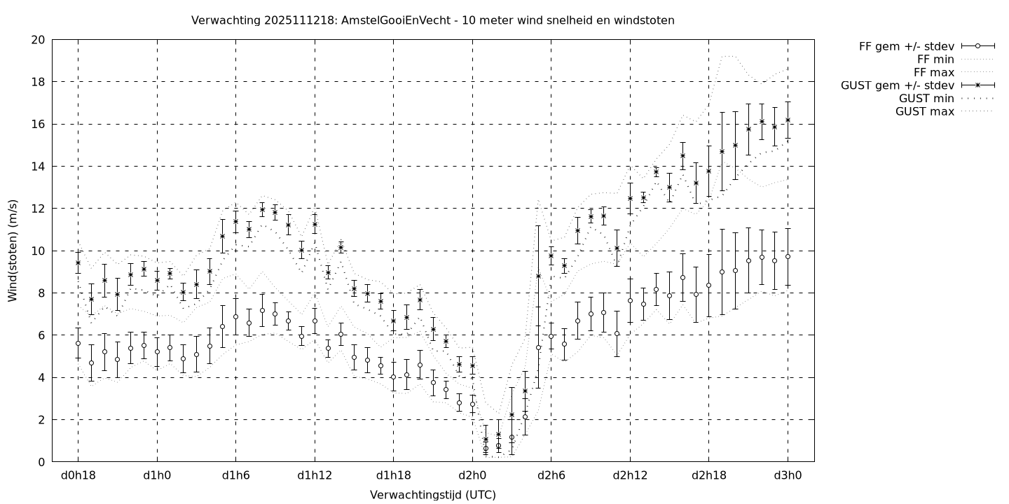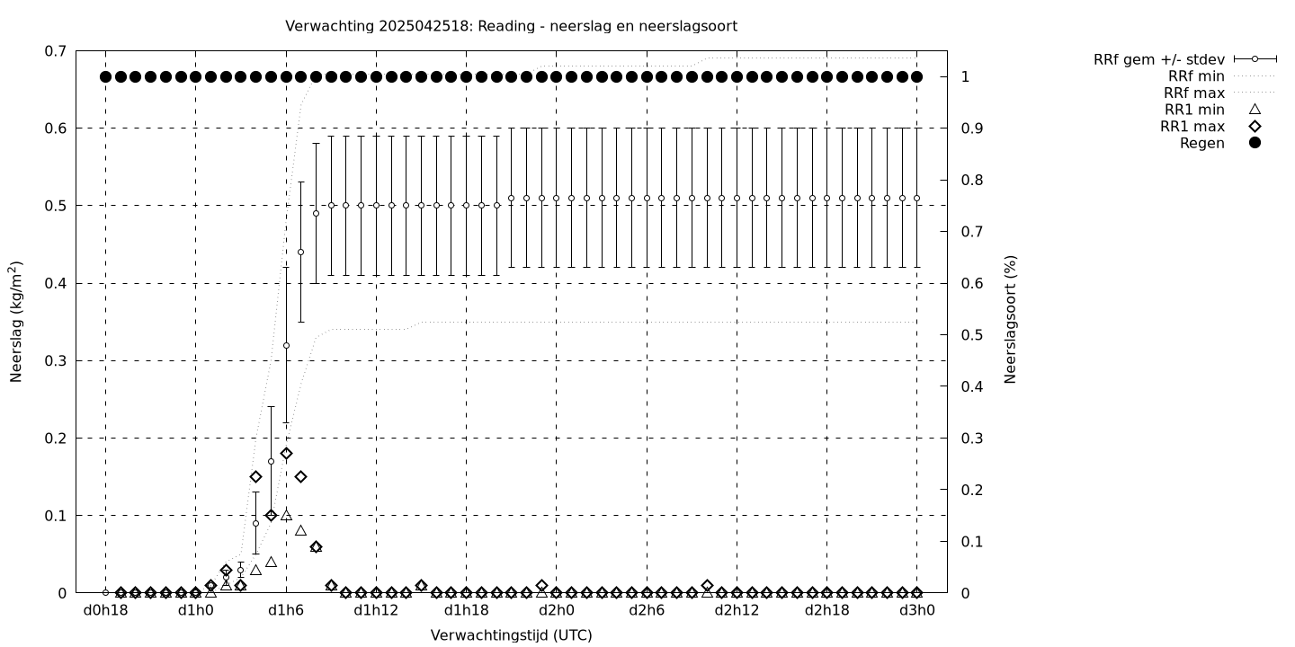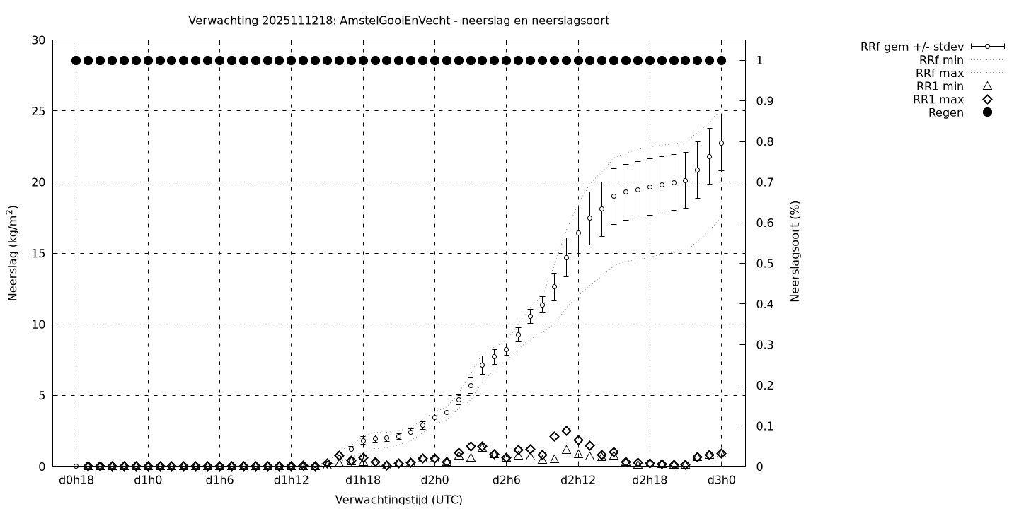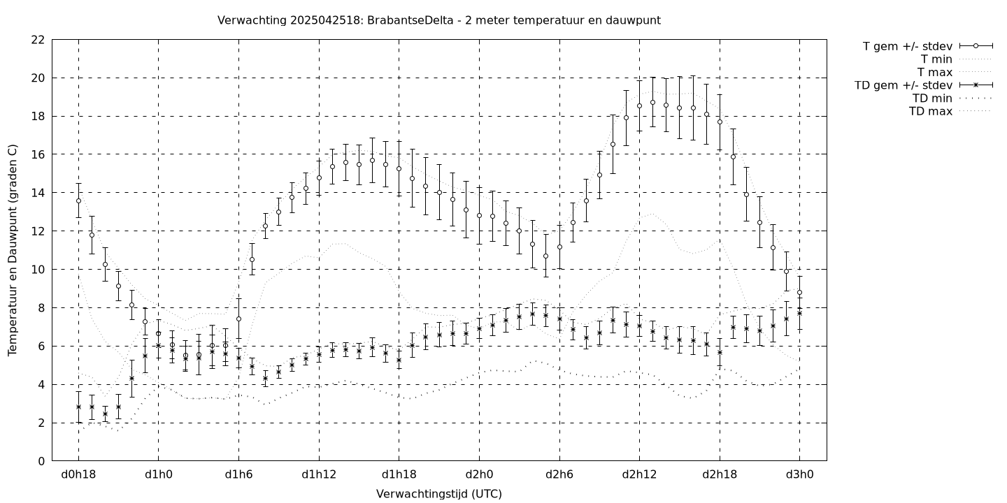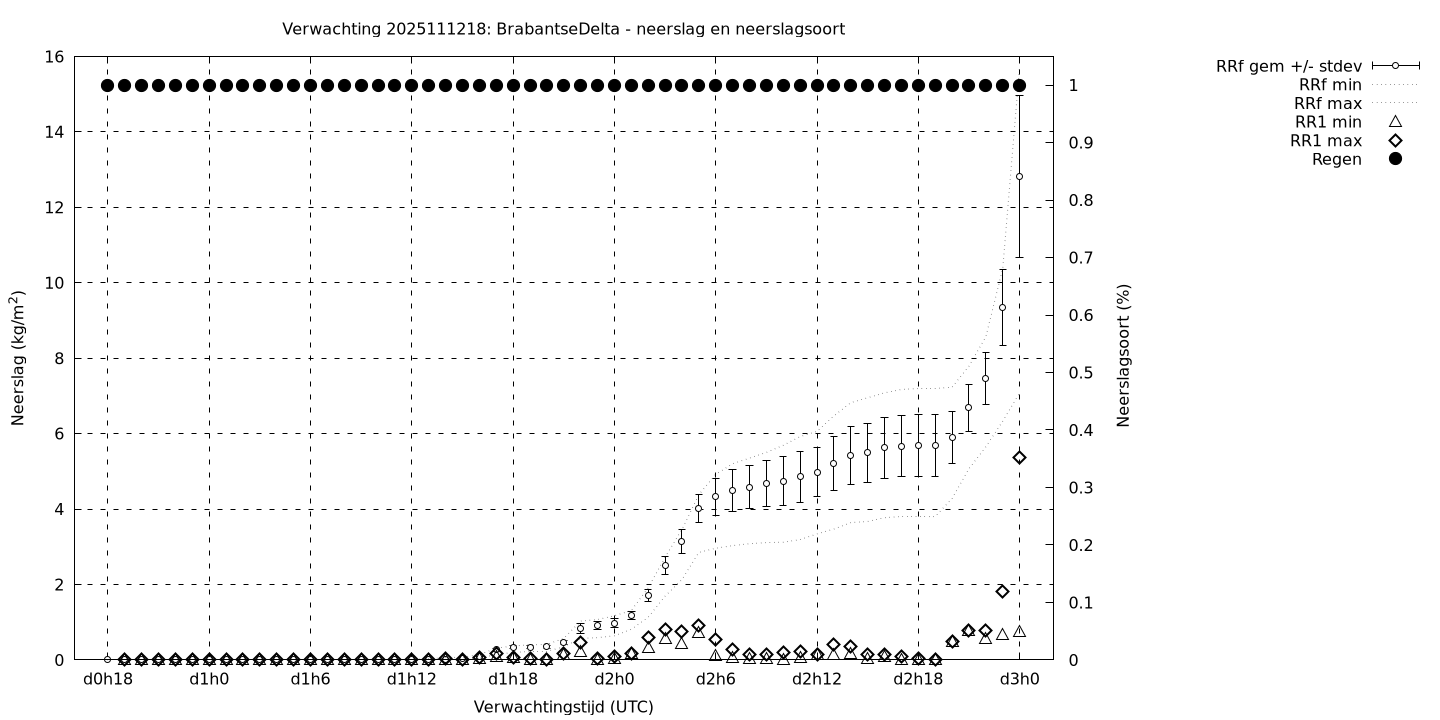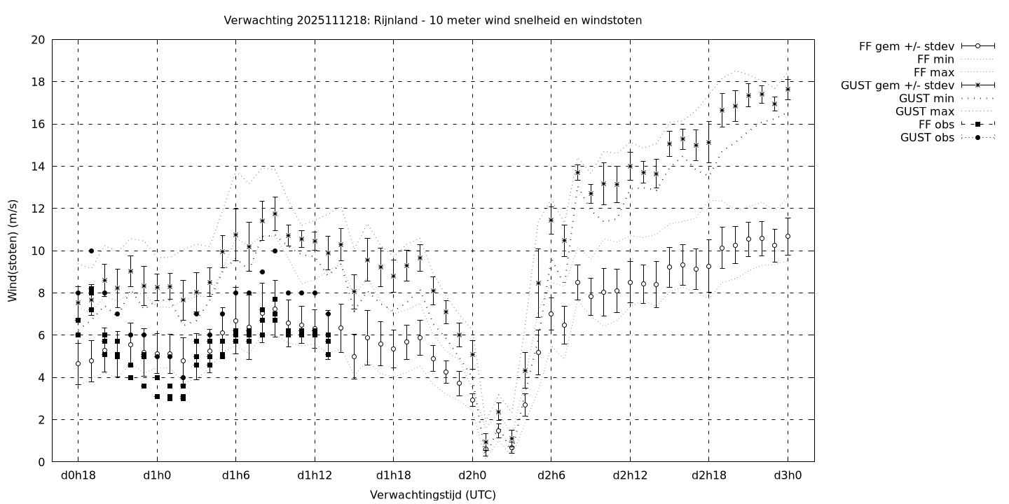 Tenslotte volgen grafieken van weersverwachtingen per locatie/waterschap, die gegoten zijn in de vorm van een tijdreeks, waarin niet alleen het gebiedsgemiddelde, maar ook de spreiding (via de standaarddeviatie) en het maximum en minimum gegeven worden. Tevens zijn de tabellen van de bijbehorende getallen gegeven.