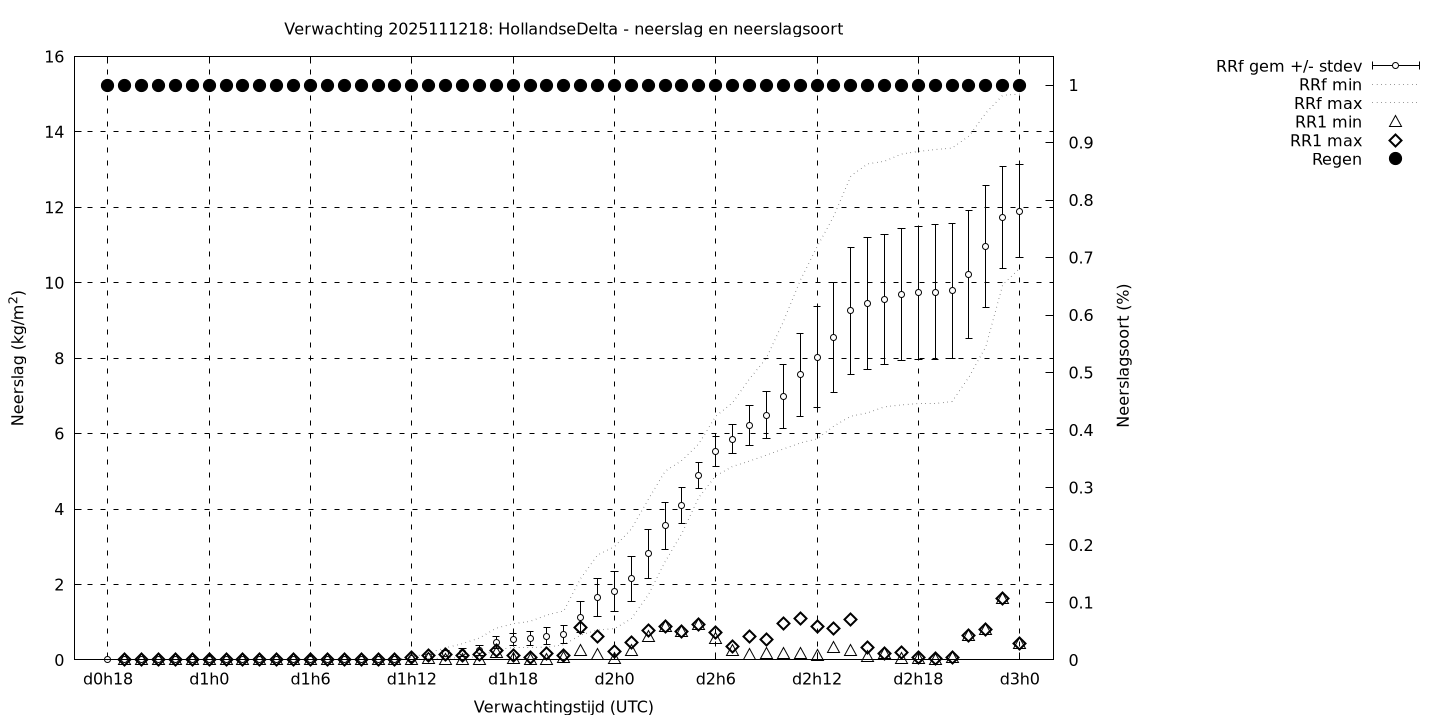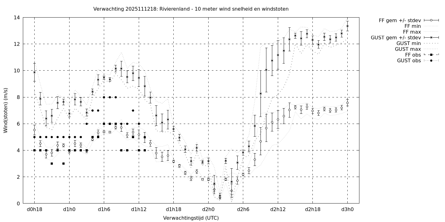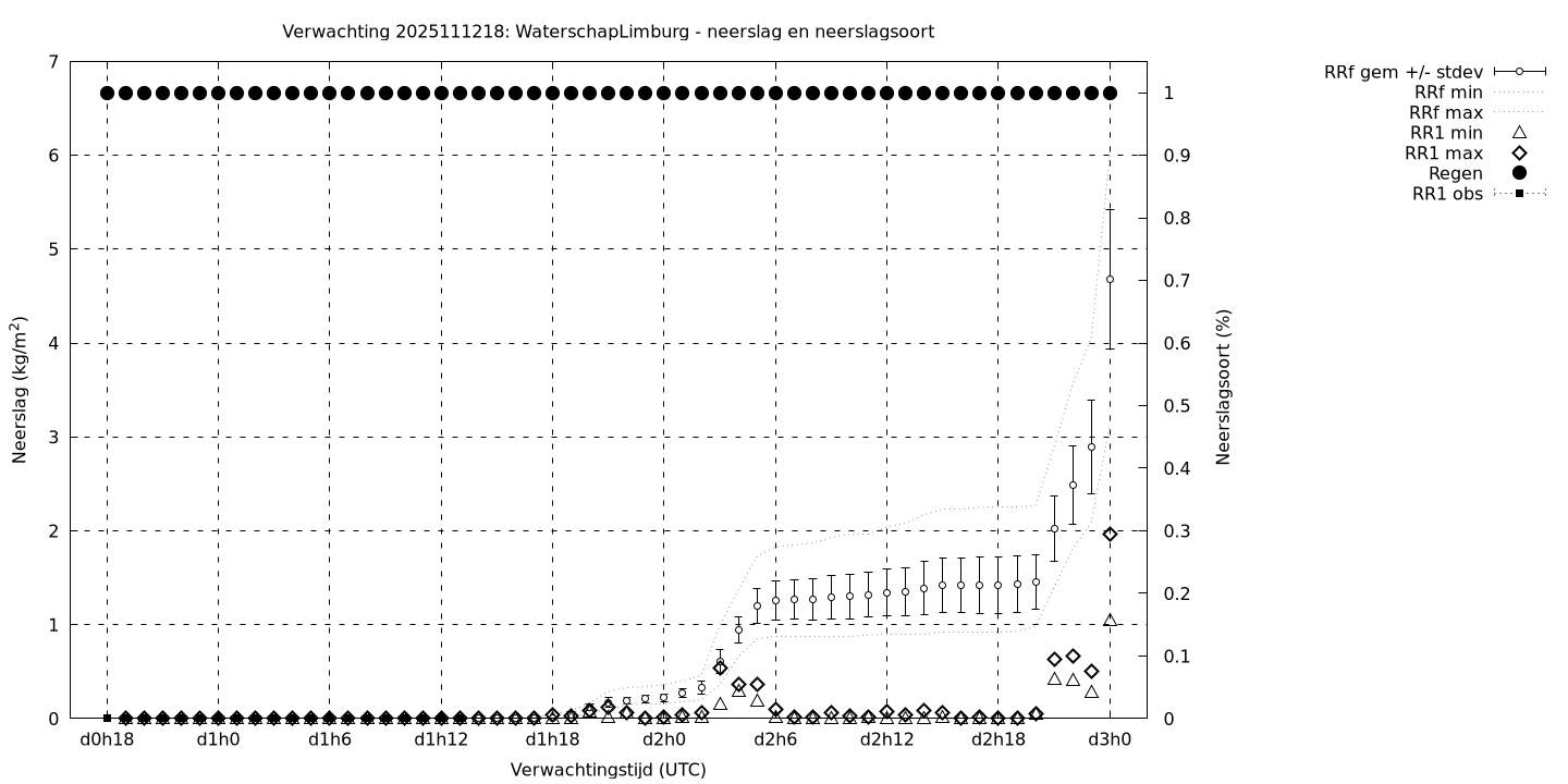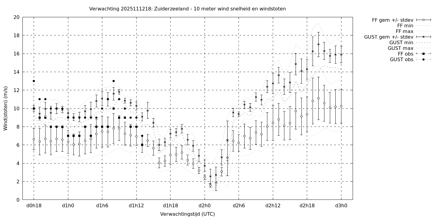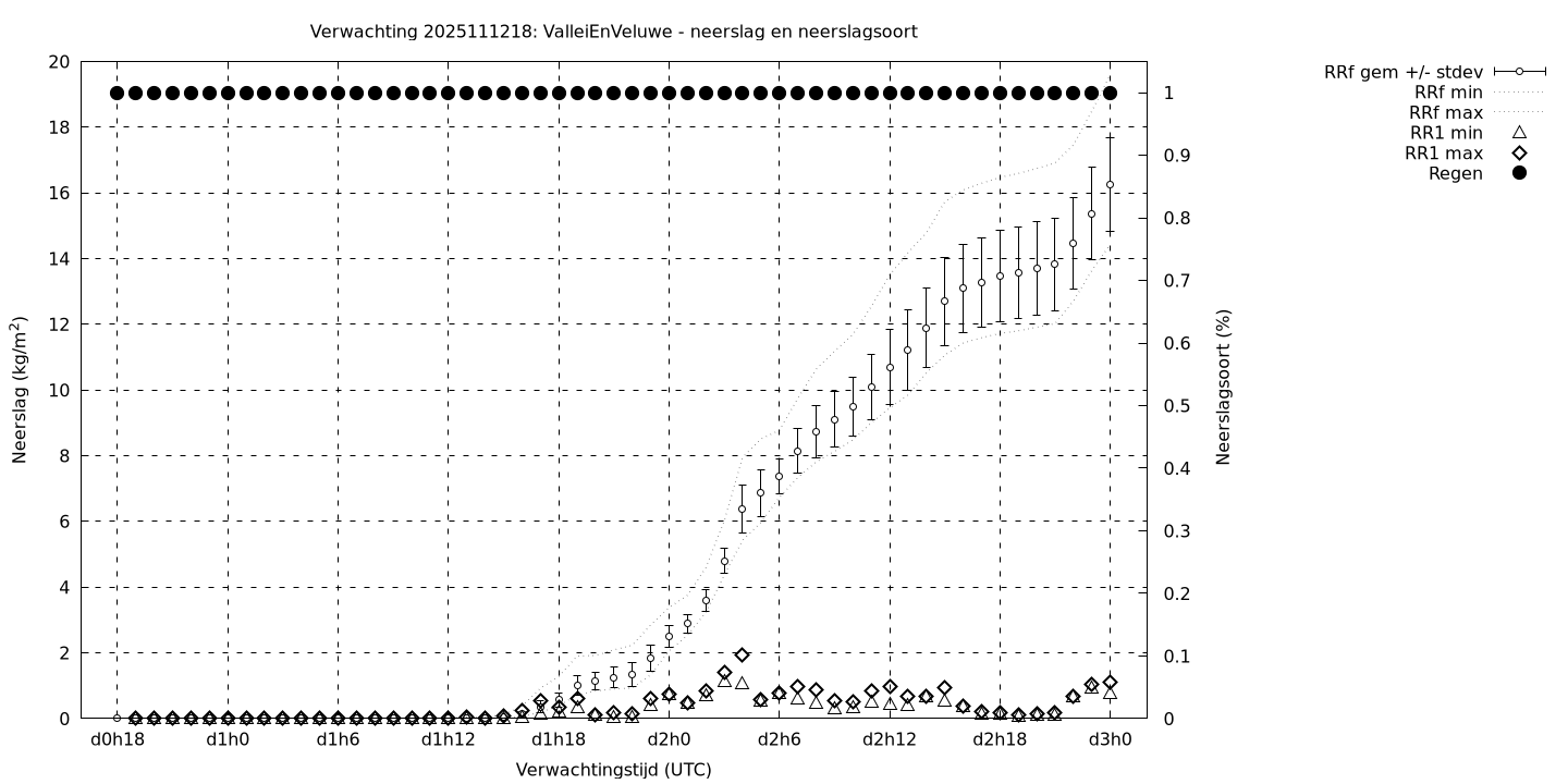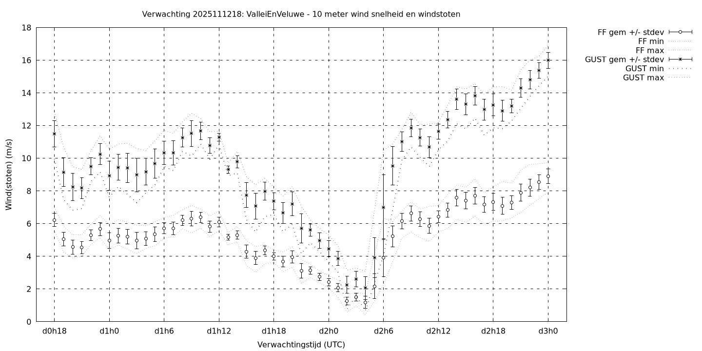 Tenslotte volgen grafieken van weersverwachtingen per locatie/waterschap, die gegoten zijn in de vorm van een tijdreeks, waarin niet alleen het gebiedsgemiddelde, maar ook de spreiding (via de standaarddeviatie) en het maximum en minimum gegeven worden. Tevens zijn de tabellen van de bijbehorende getallen gegeven.