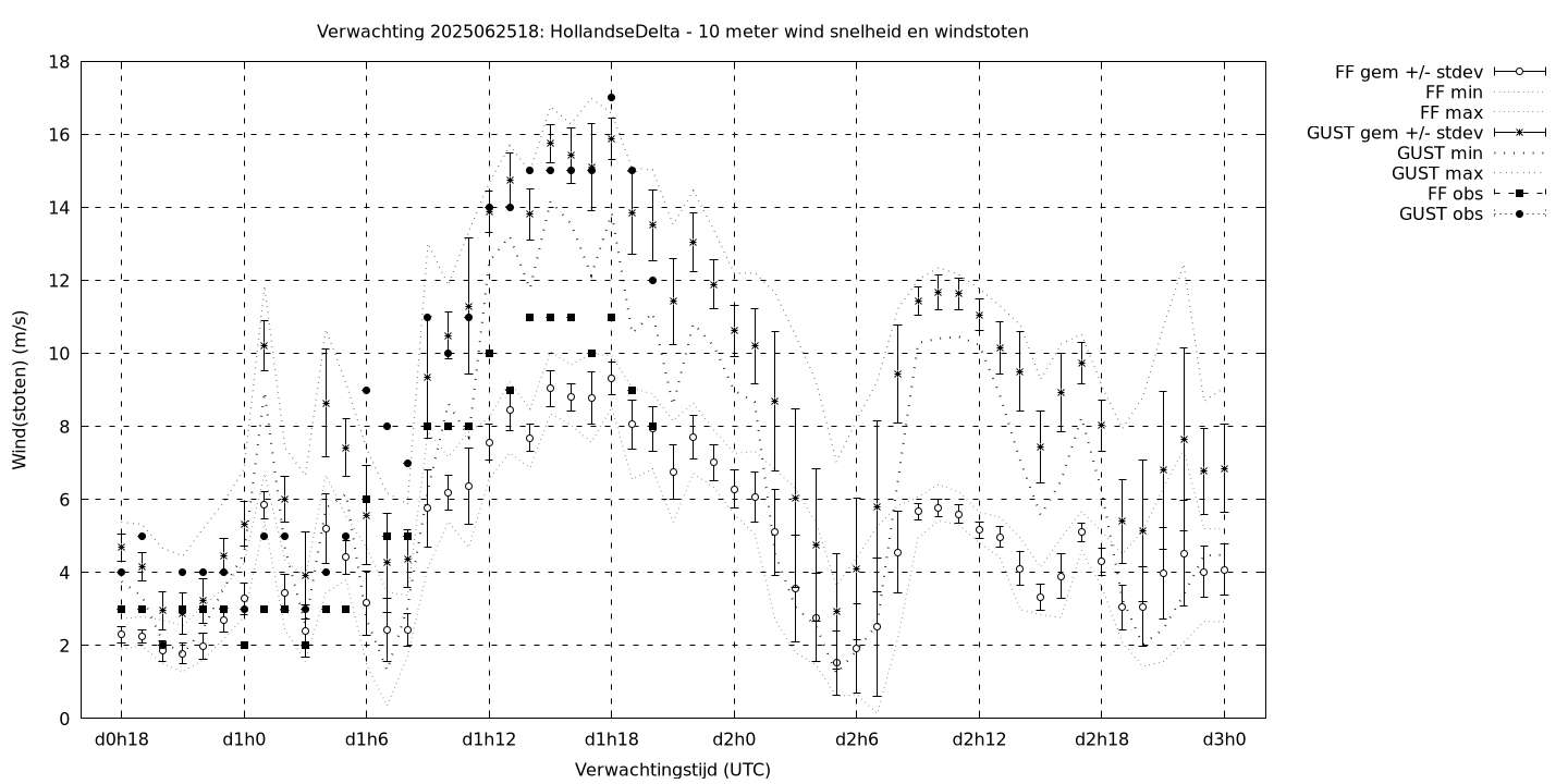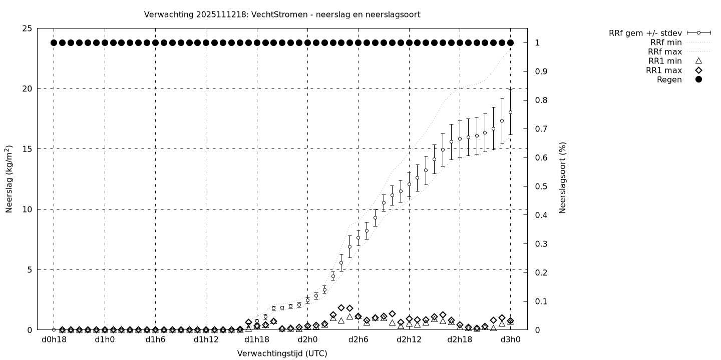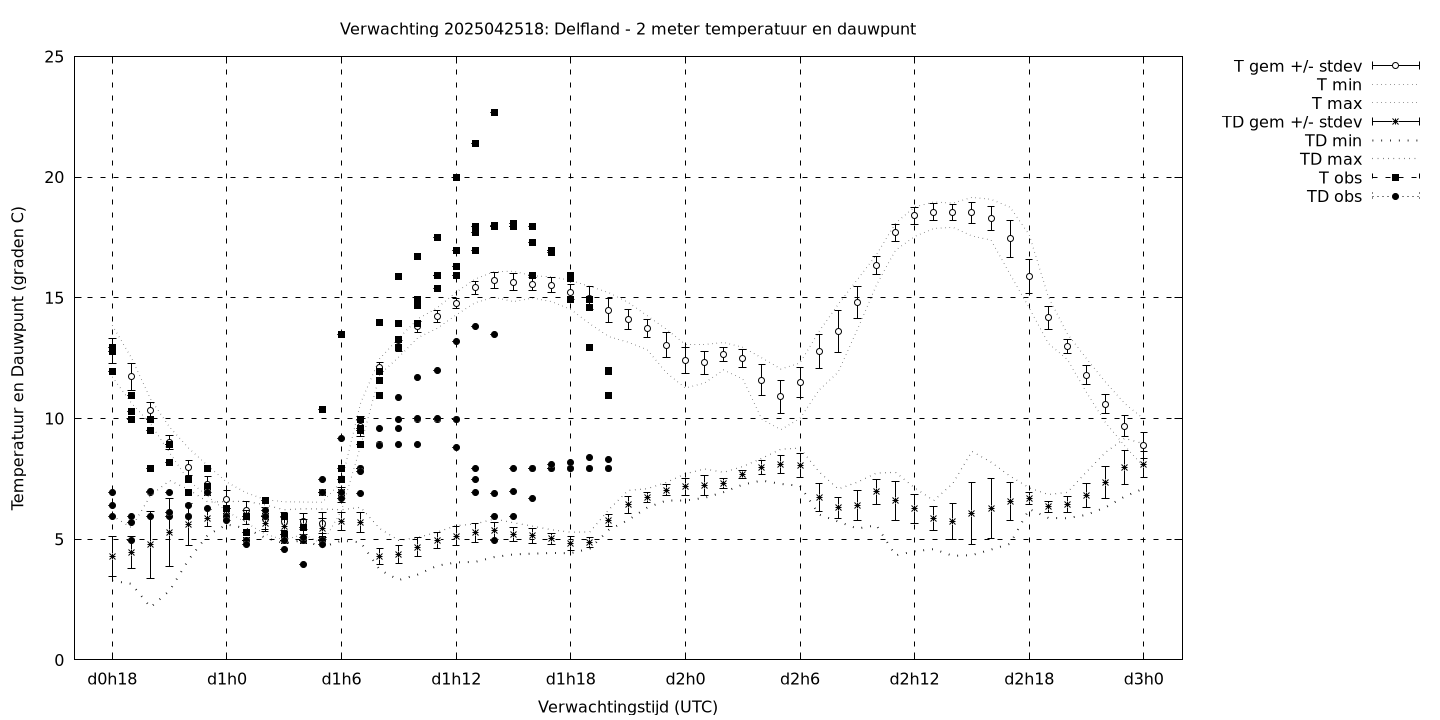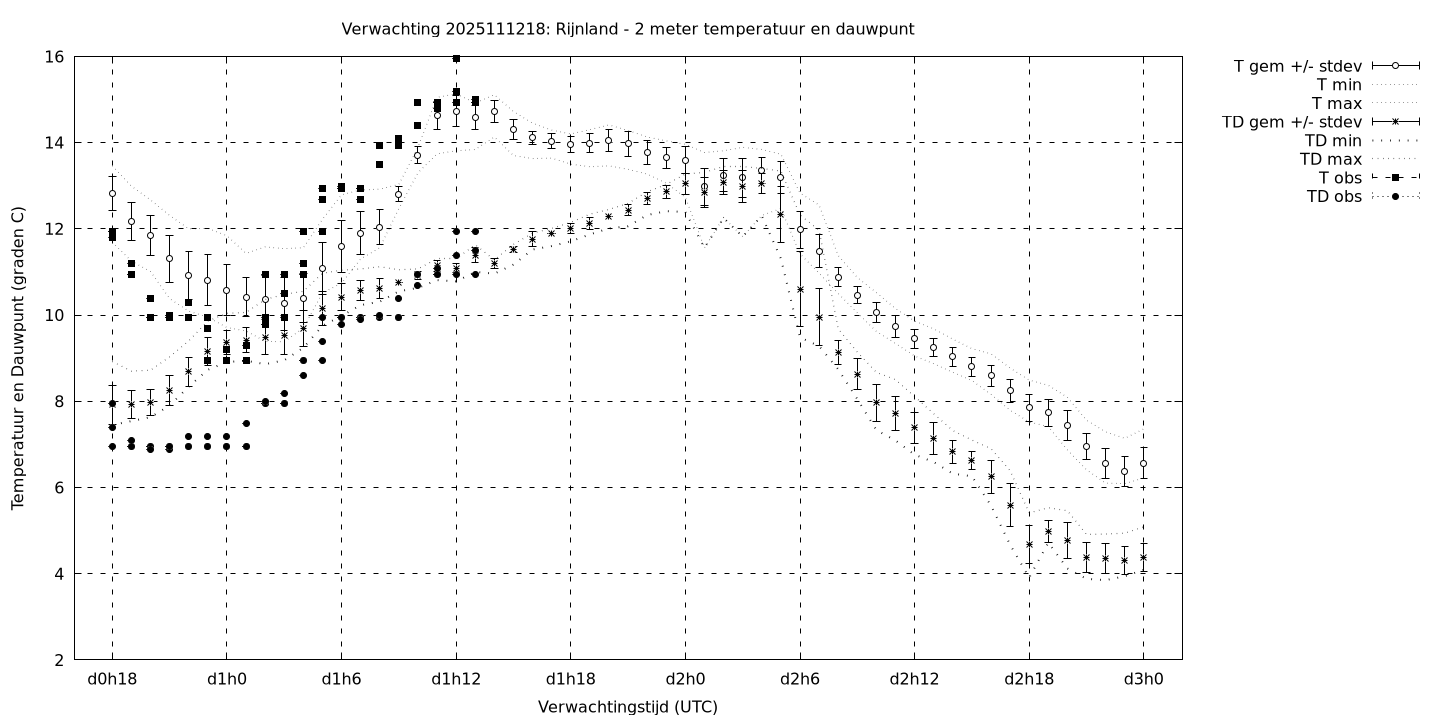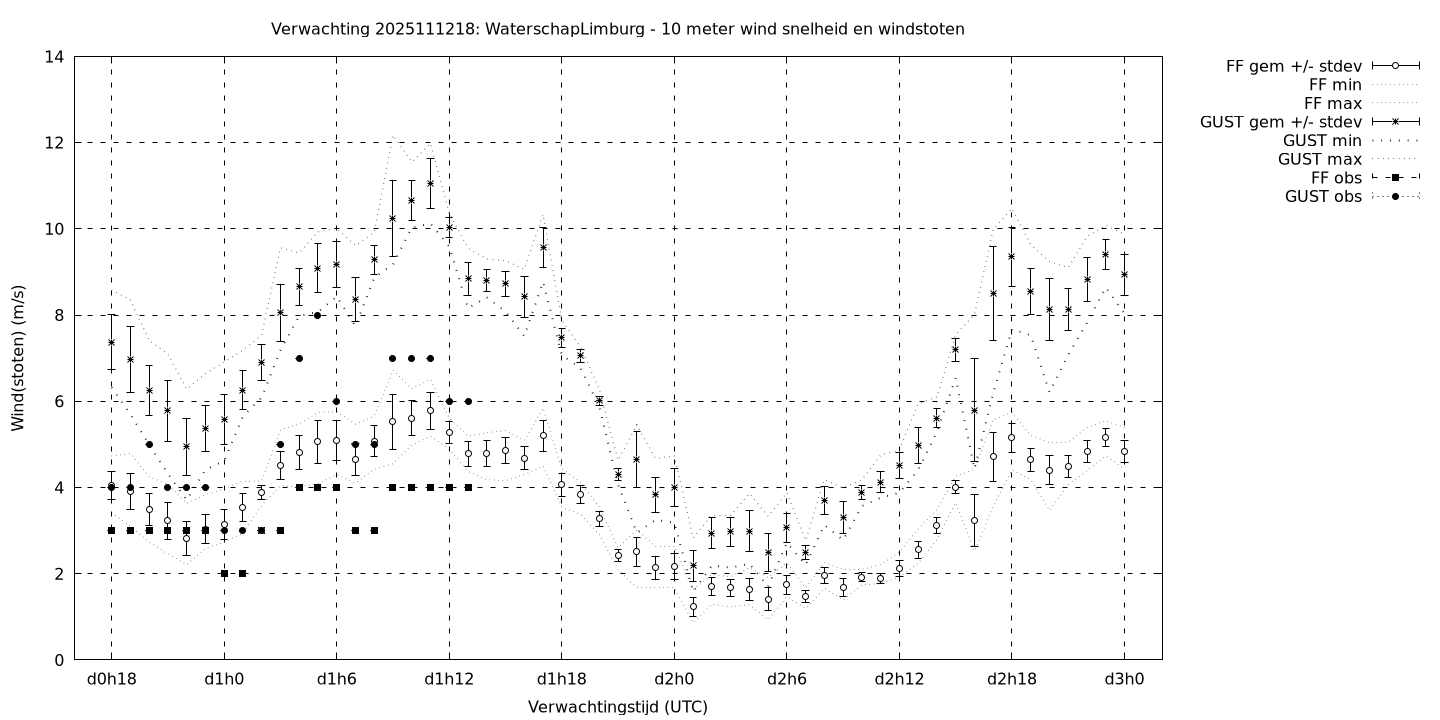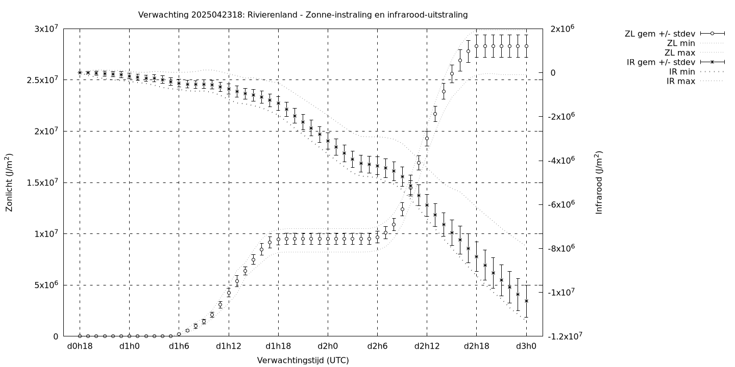 Tenslotte volgen grafieken van weersverwachtingen per locatie/waterschap, die gegoten zijn in de vorm van een tijdreeks, waarin niet alleen het gebiedsgemiddelde, maar ook de spreiding (via de standaarddeviatie) en het maximum en minimum gegeven worden. Tevens zijn de tabellen van de bijbehorende getallen gegeven.