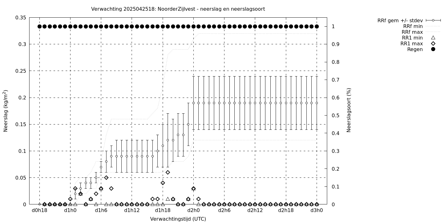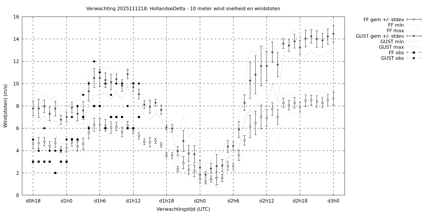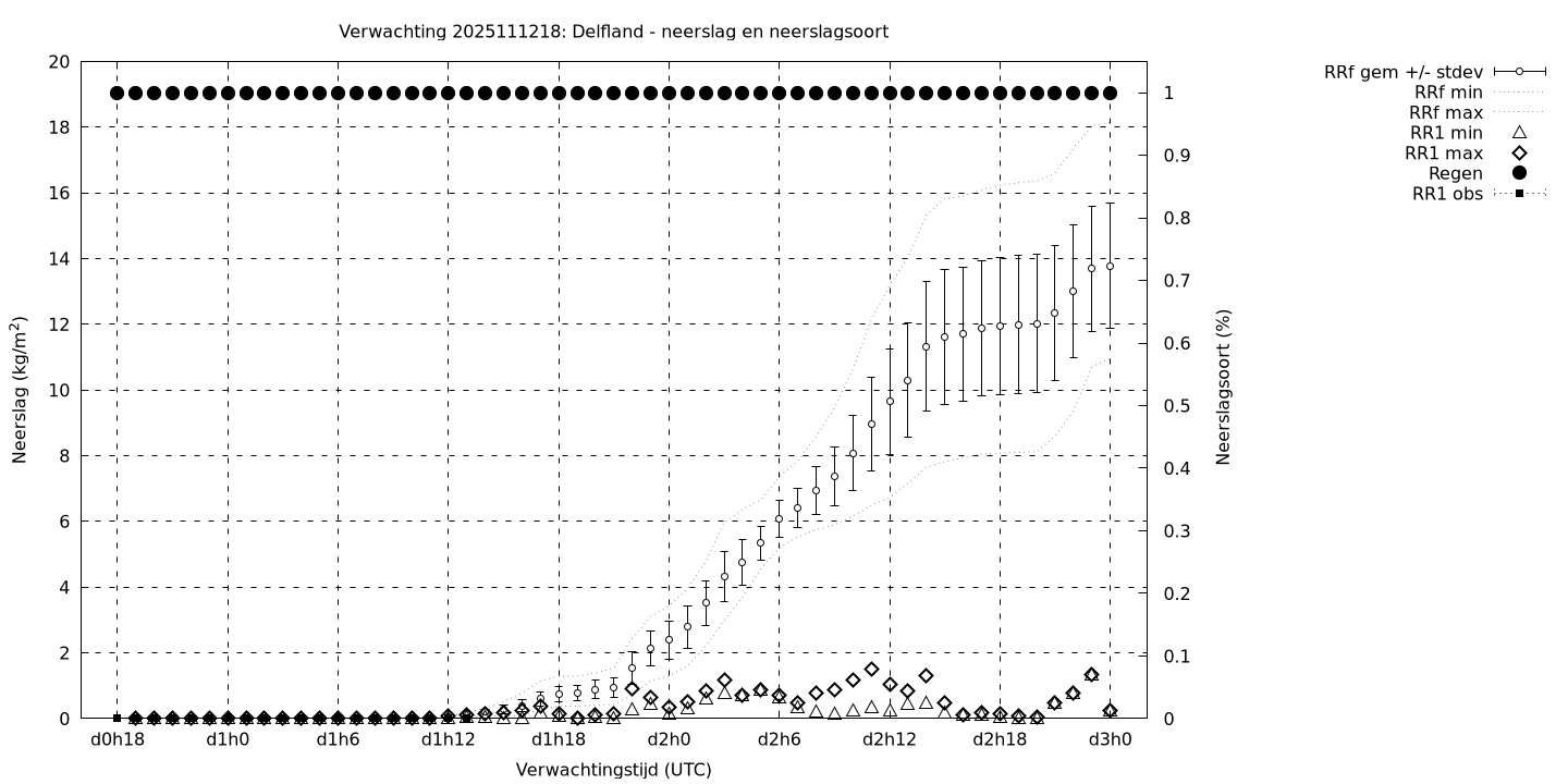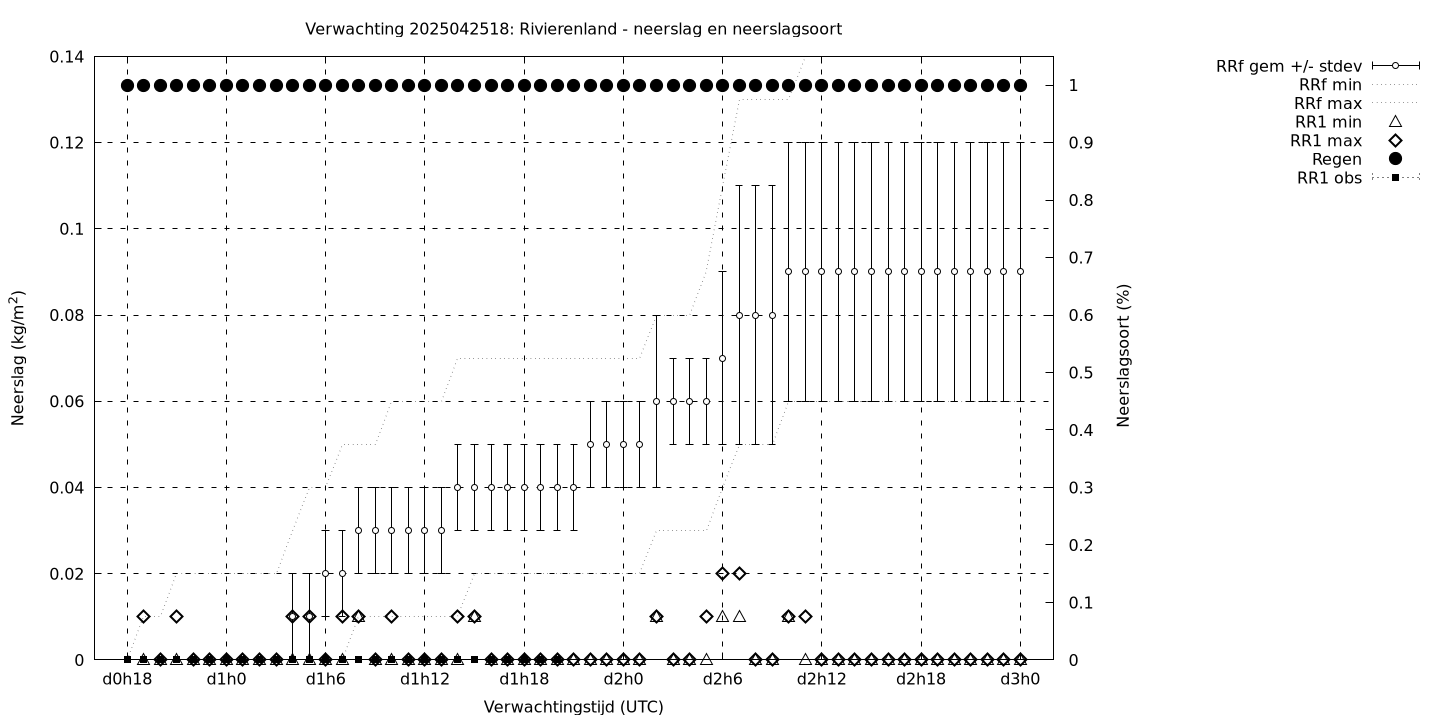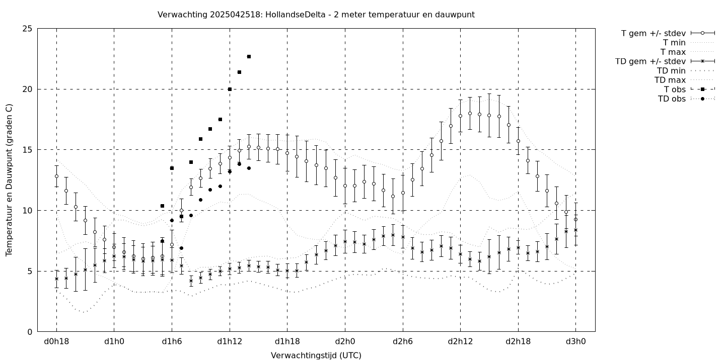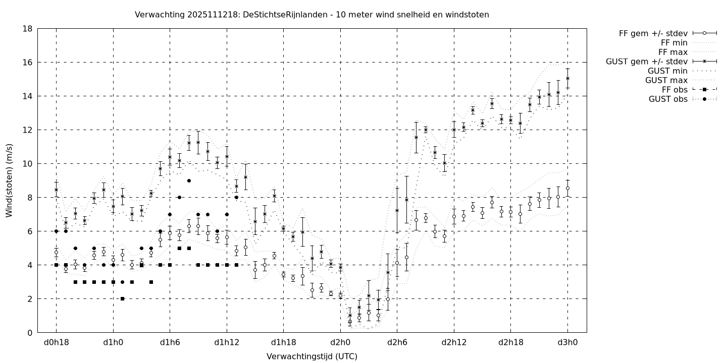 Tenslotte volgen grafieken van weersverwachtingen per locatie/waterschap, die gegoten zijn in de vorm van een tijdreeks, waarin niet alleen het gebiedsgemiddelde, maar ook de spreiding (via de standaarddeviatie) en het maximum en minimum gegeven worden. Tevens zijn de tabellen van de bijbehorende getallen gegeven.