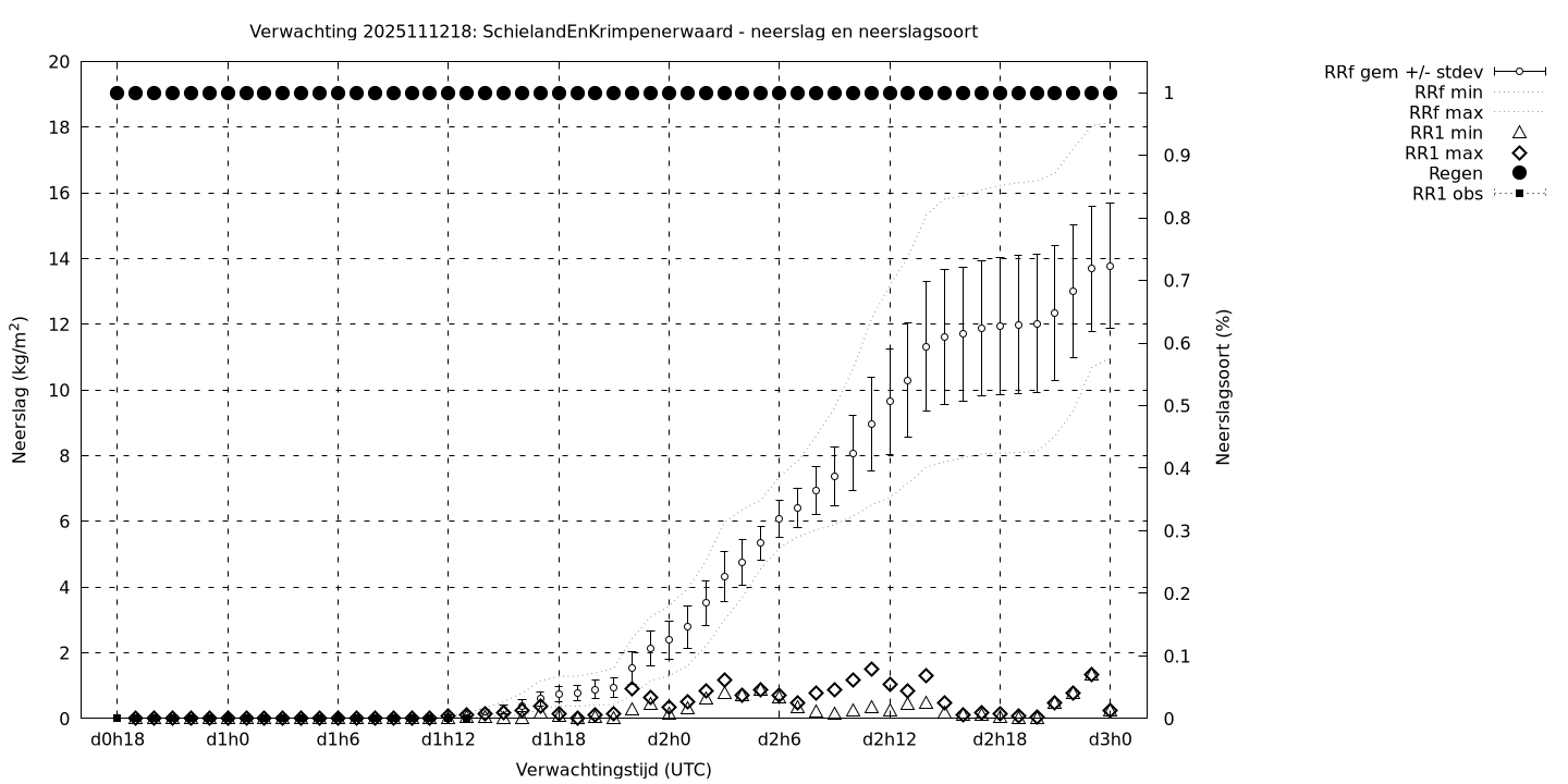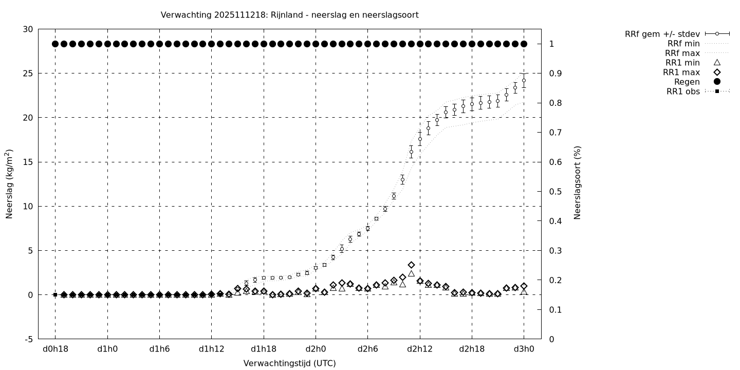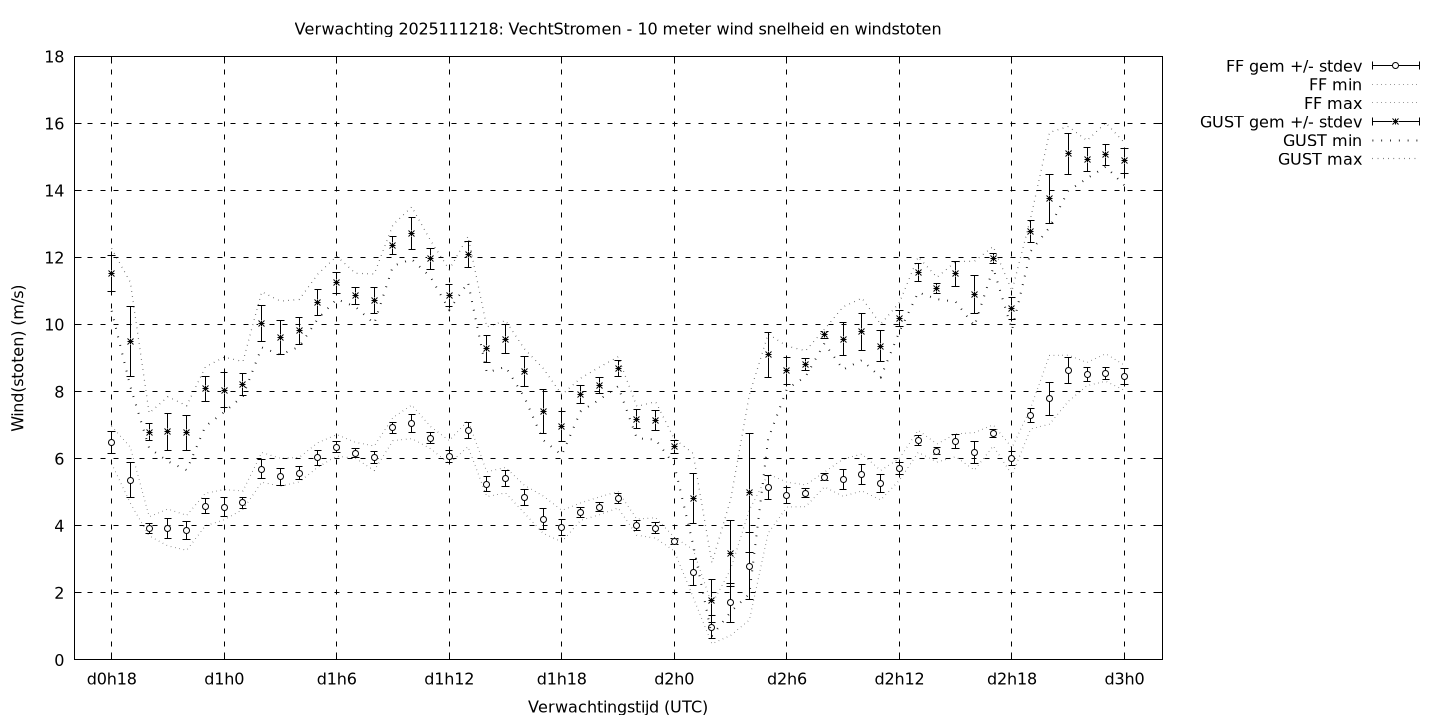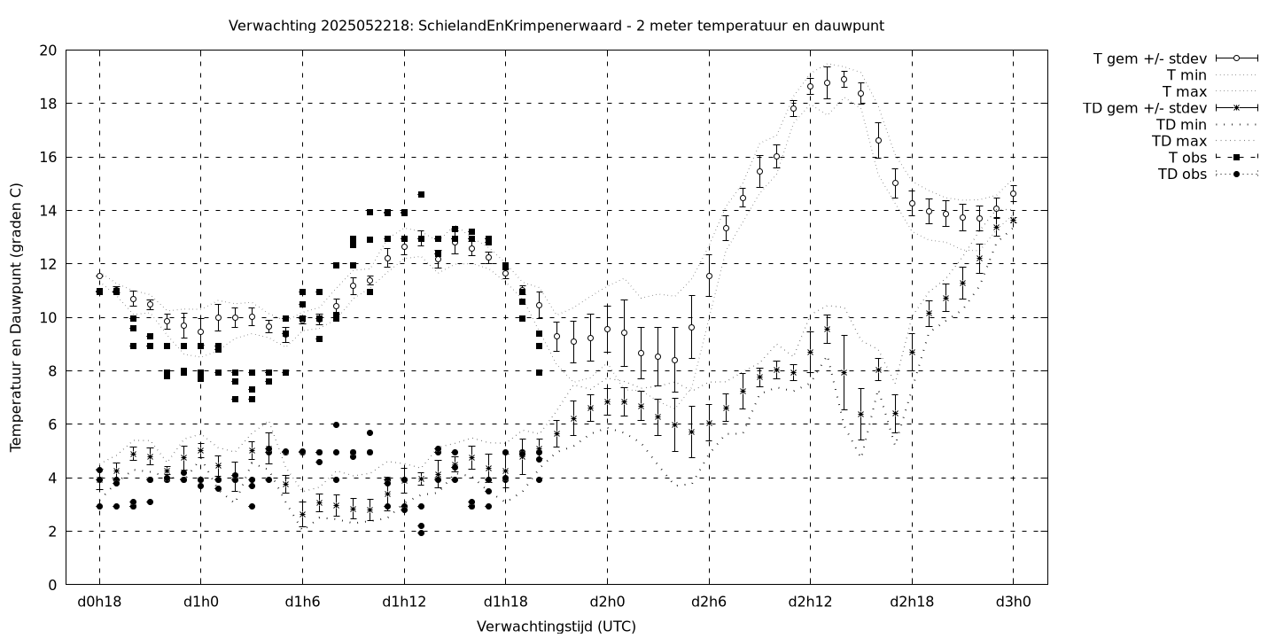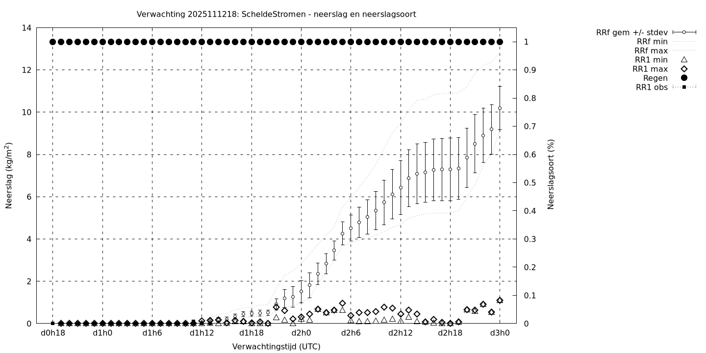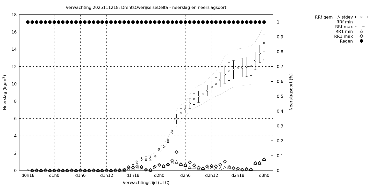 Tenslotte volgen grafieken van weersverwachtingen per locatie/waterschap, die gegoten zijn in de vorm van een tijdreeks, waarin niet alleen het gebiedsgemiddelde, maar ook de spreiding (via de standaarddeviatie) en het maximum en minimum gegeven worden. Tevens zijn de tabellen van de bijbehorende getallen gegeven.