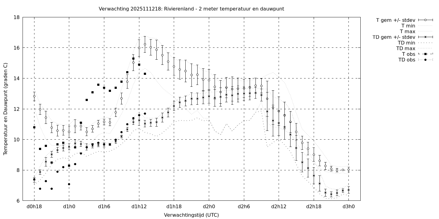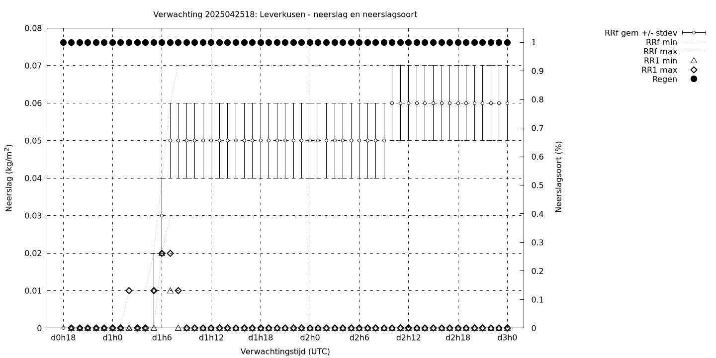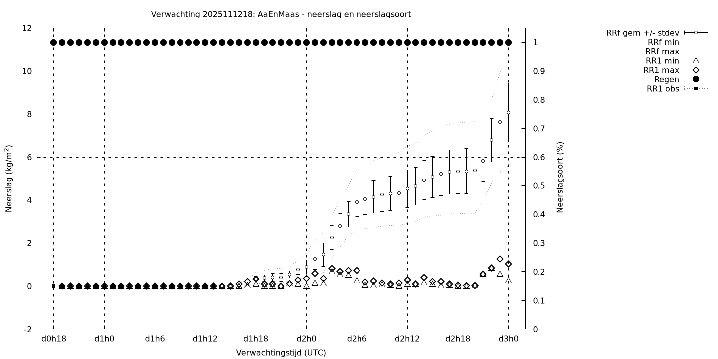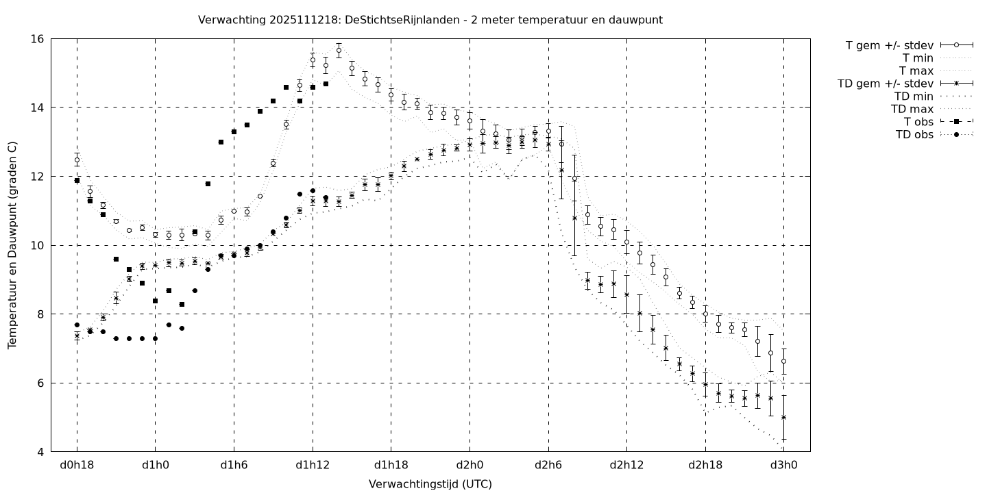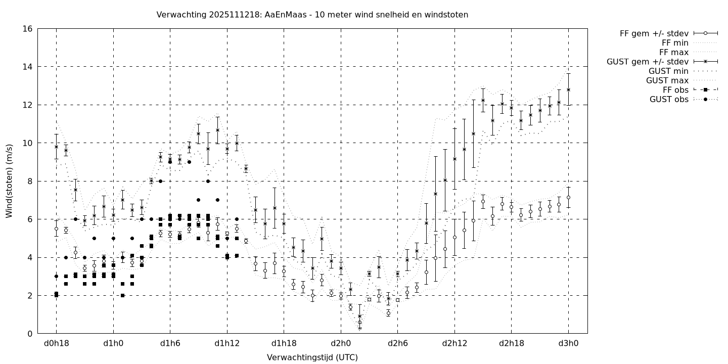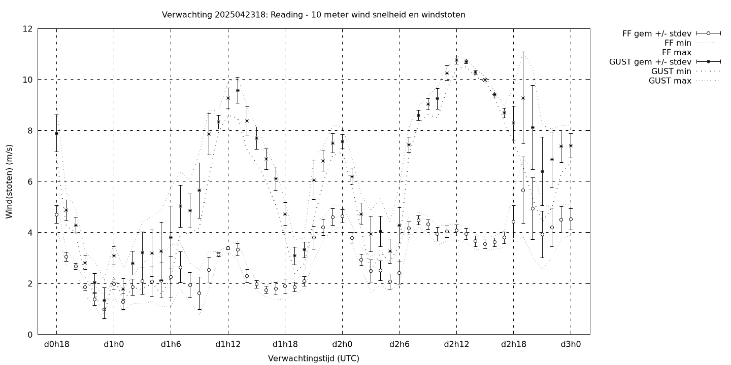 Tenslotte volgen grafieken van weersverwachtingen per locatie/waterschap, die gegoten zijn in de vorm van een tijdreeks, waarin niet alleen het gebiedsgemiddelde, maar ook de spreiding (via de standaarddeviatie) en het maximum en minimum gegeven worden. Tevens zijn de tabellen van de bijbehorende getallen gegeven.