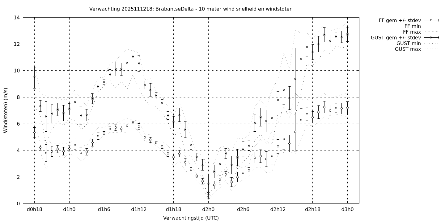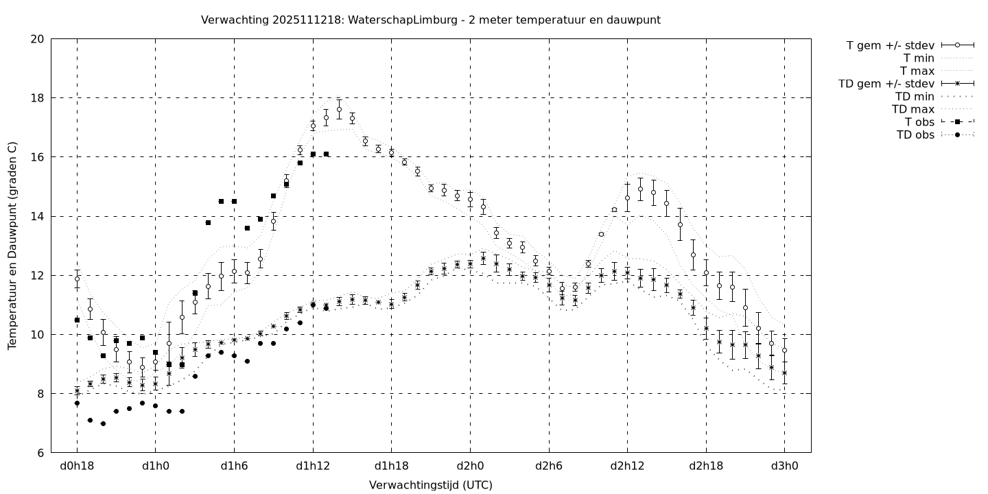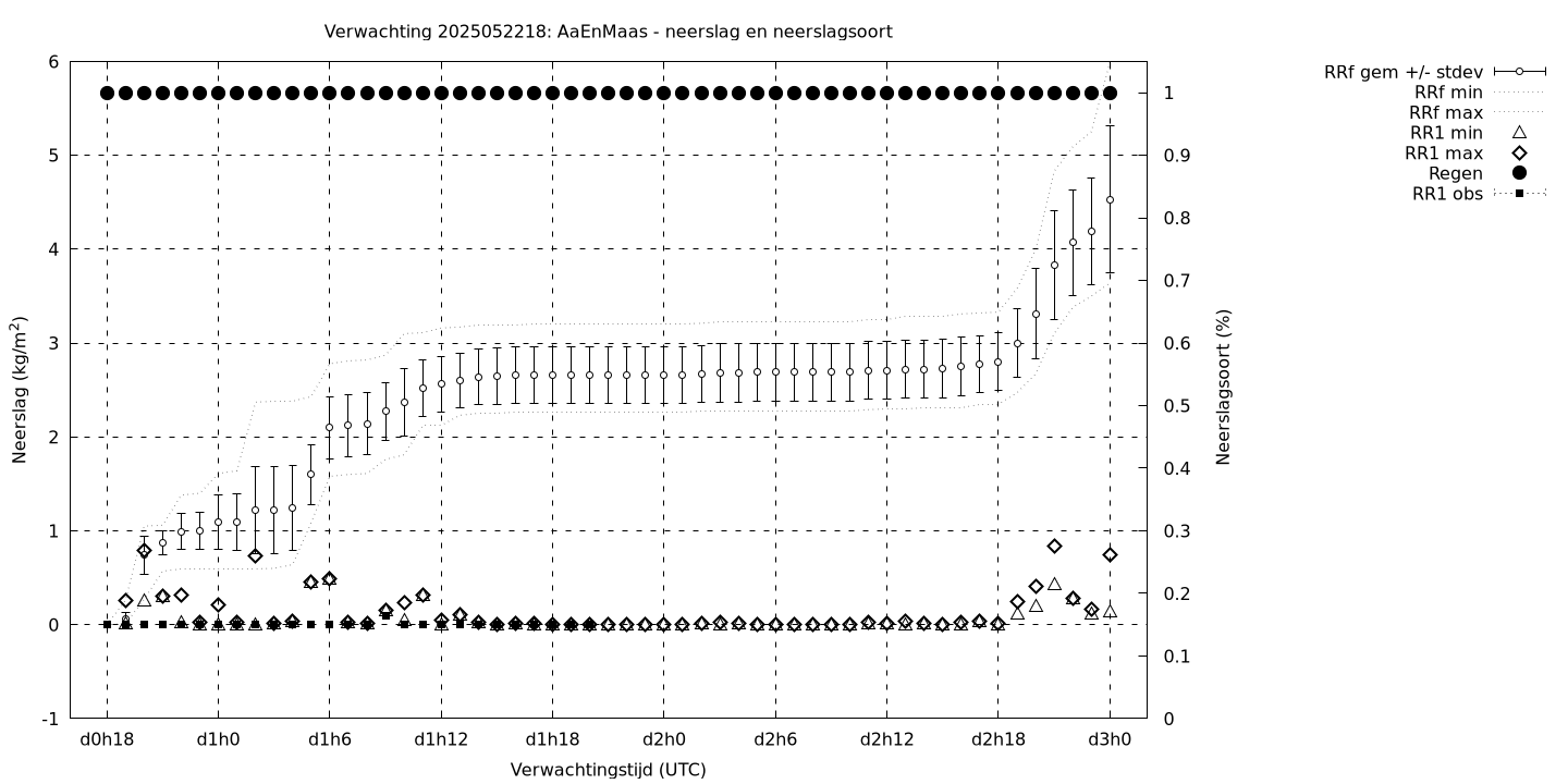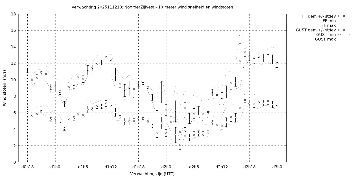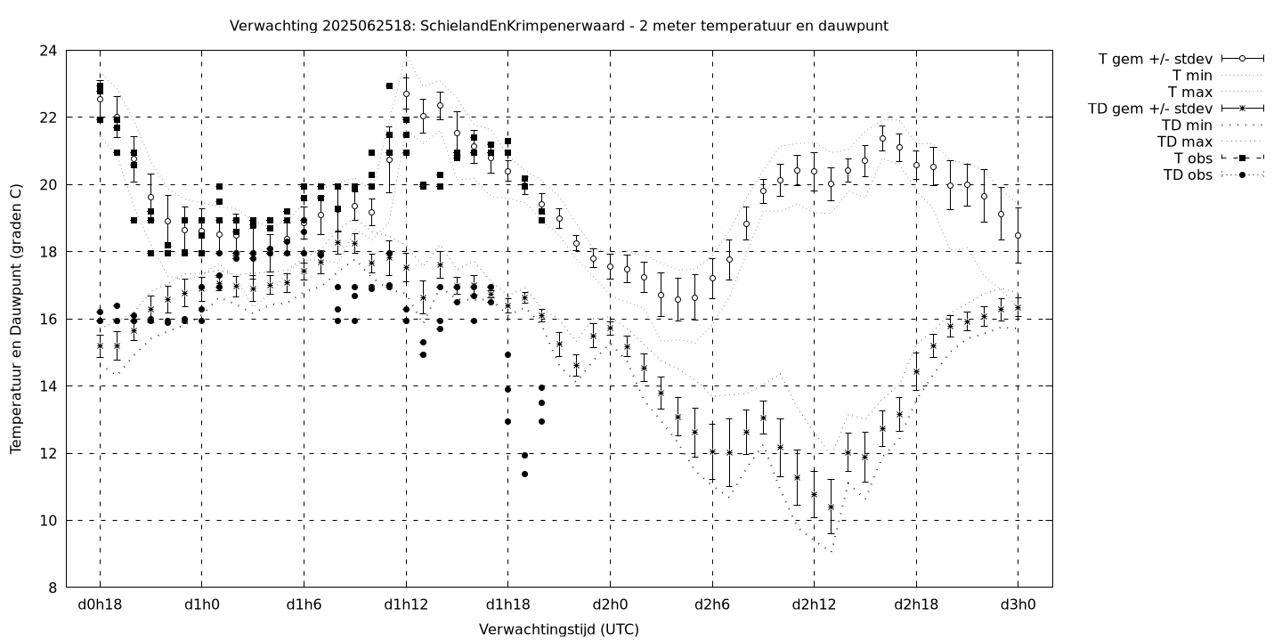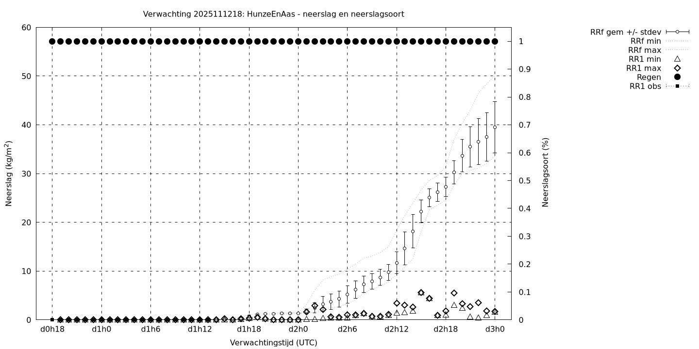 Tenslotte volgen grafieken van weersverwachtingen per locatie/waterschap, die gegoten zijn in de vorm van een tijdreeks, waarin niet alleen het gebiedsgemiddelde, maar ook de spreiding (via de standaarddeviatie) en het maximum en minimum gegeven worden. Tevens zijn de tabellen van de bijbehorende getallen gegeven.