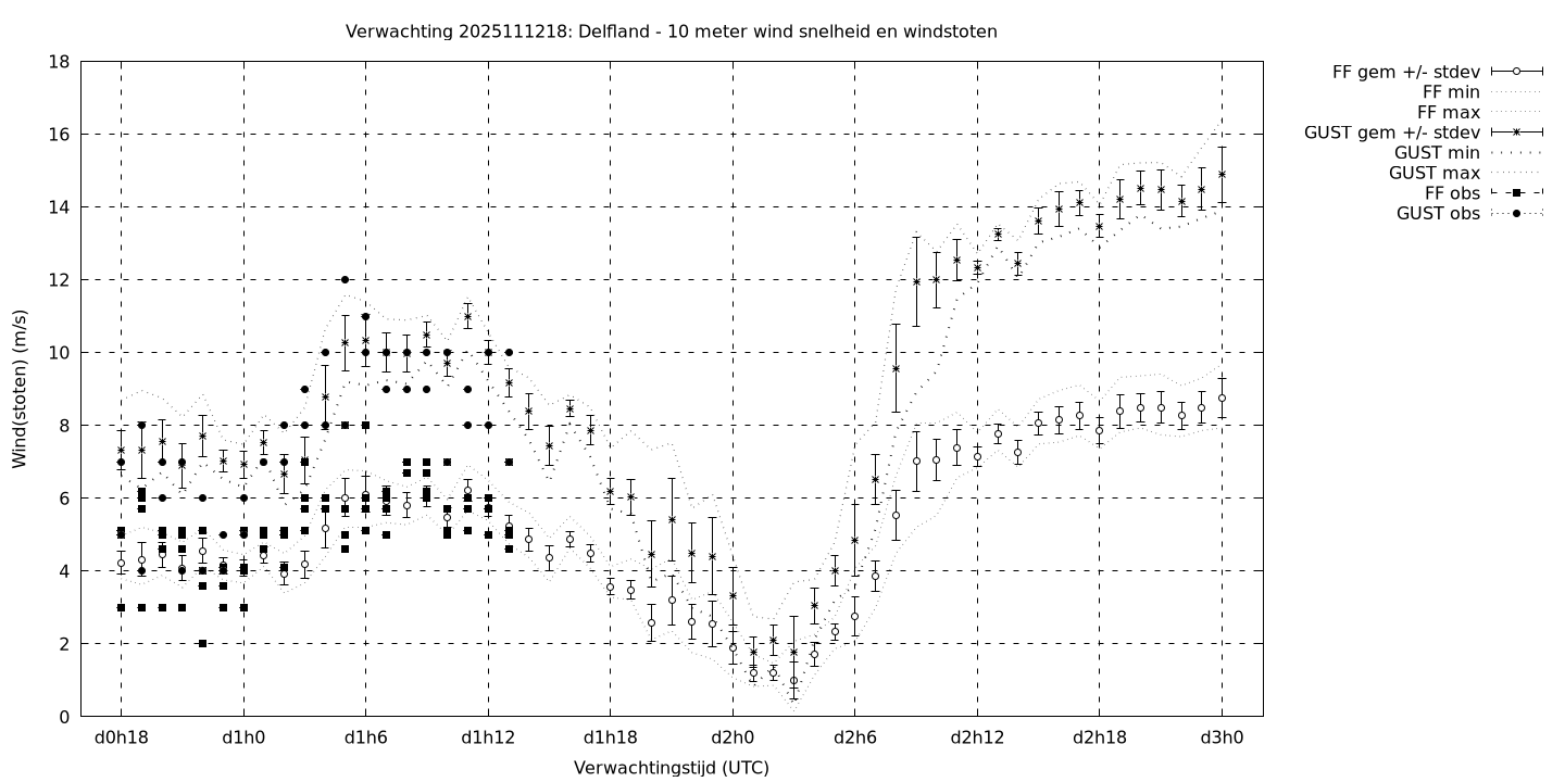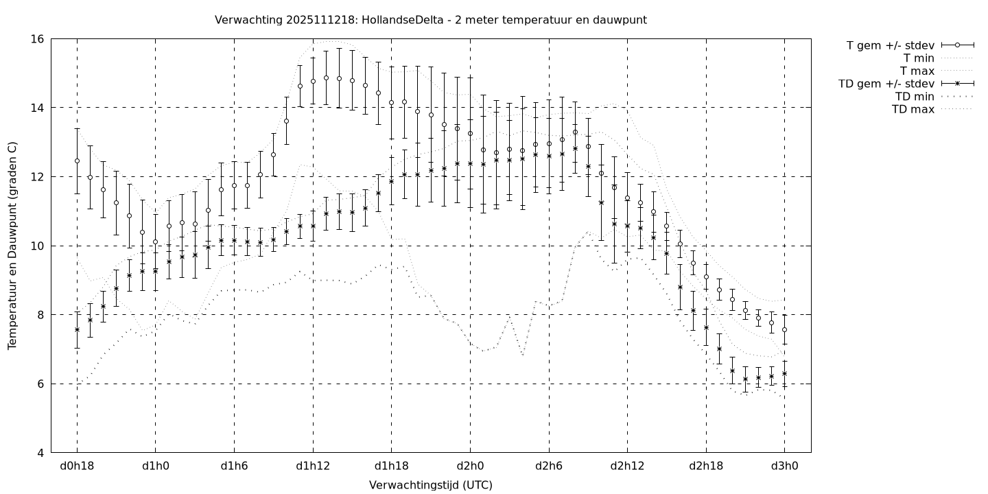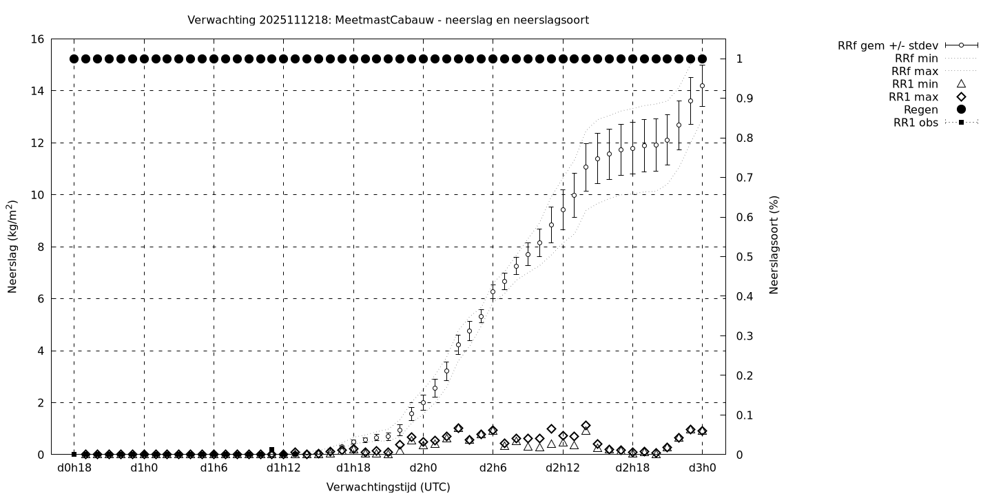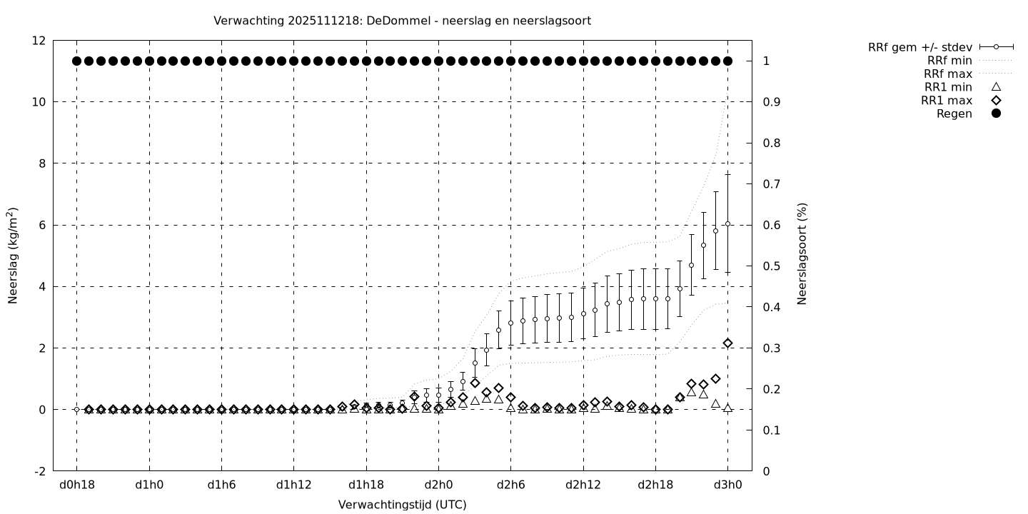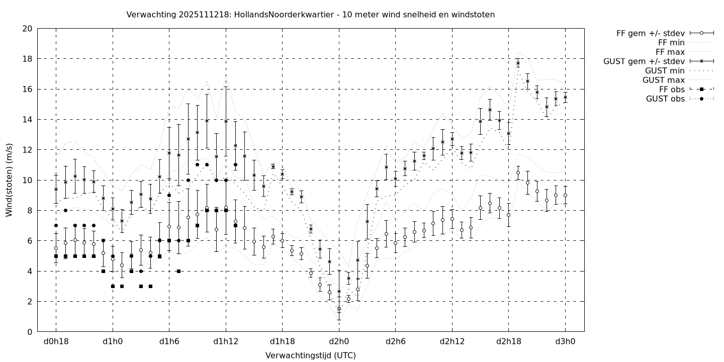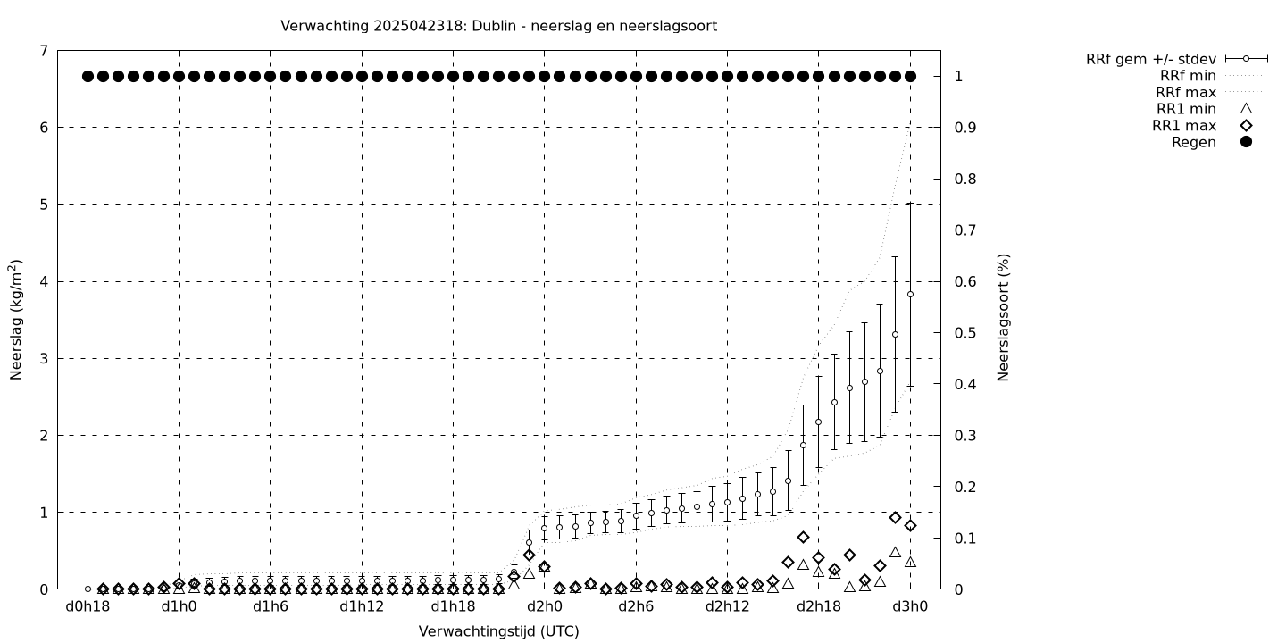 Tenslotte volgen grafieken van weersverwachtingen per locatie/waterschap, die gegoten zijn in de vorm van een tijdreeks, waarin niet alleen het gebiedsgemiddelde, maar ook de spreiding (via de standaarddeviatie) en het maximum en minimum gegeven worden. Tevens zijn de tabellen van de bijbehorende getallen gegeven.