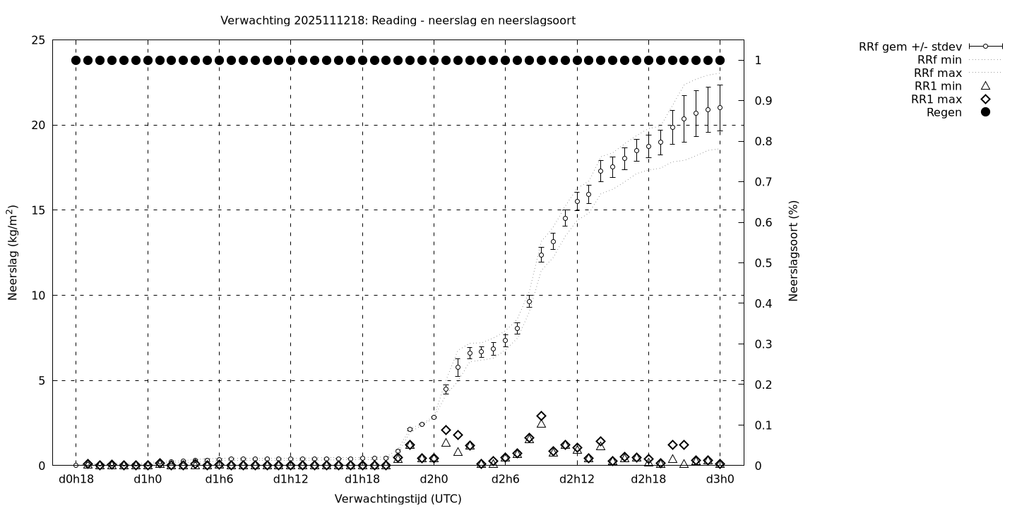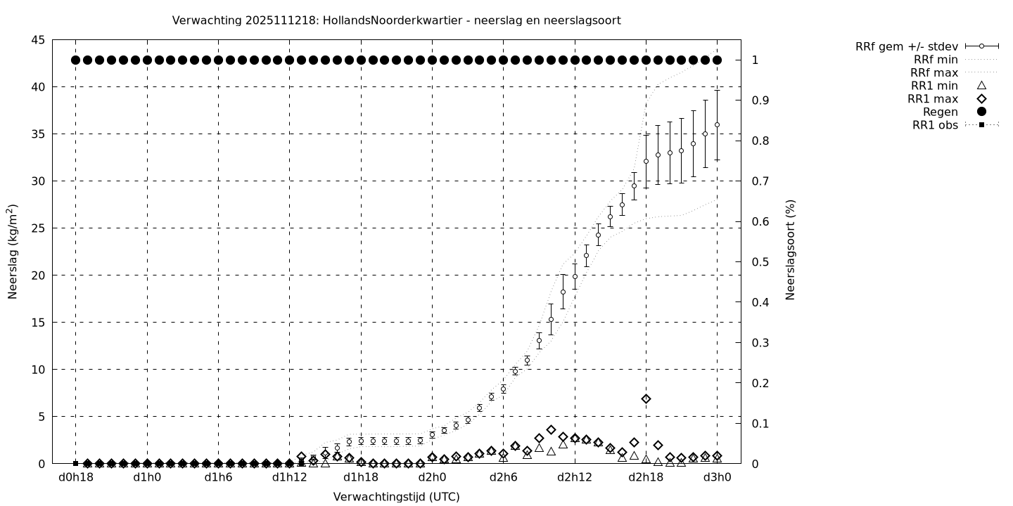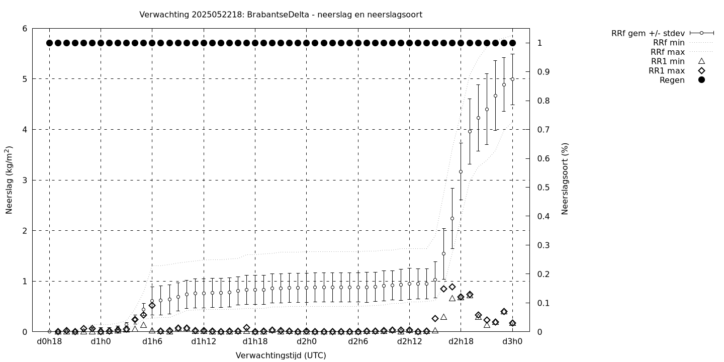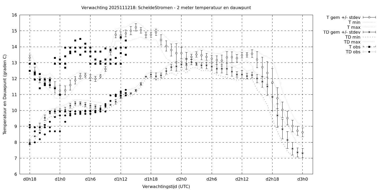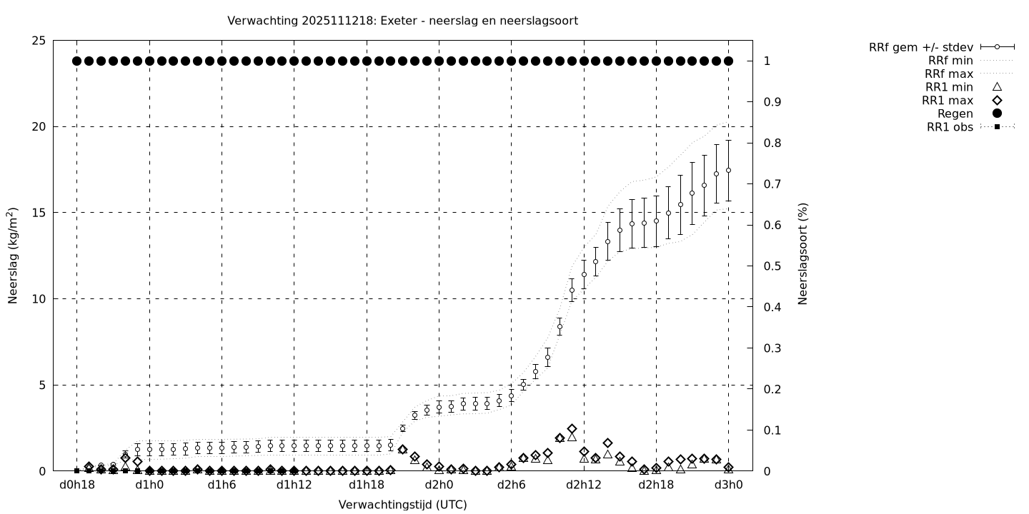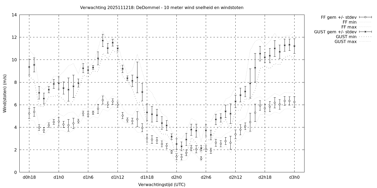 Tenslotte volgen grafieken van weersverwachtingen per locatie/waterschap, die gegoten zijn in de vorm van een tijdreeks, waarin niet alleen het gebiedsgemiddelde, maar ook de spreiding (via de standaarddeviatie) en het maximum en minimum gegeven worden. Tevens zijn de tabellen van de bijbehorende getallen gegeven.