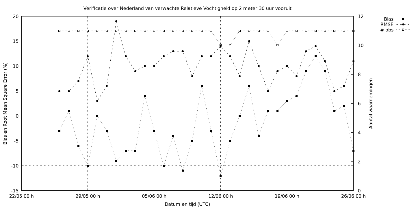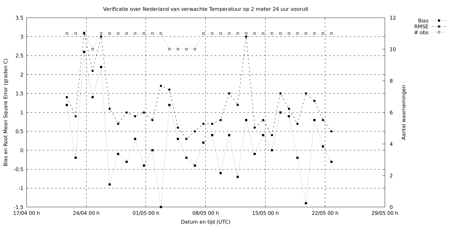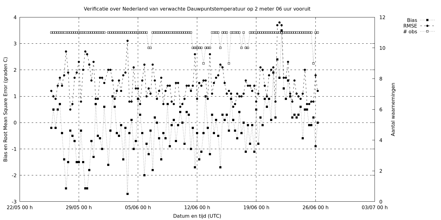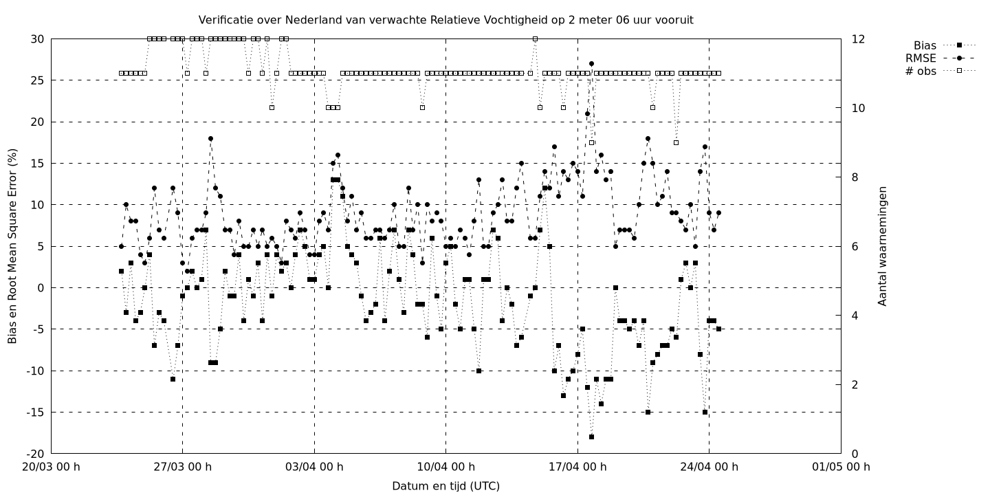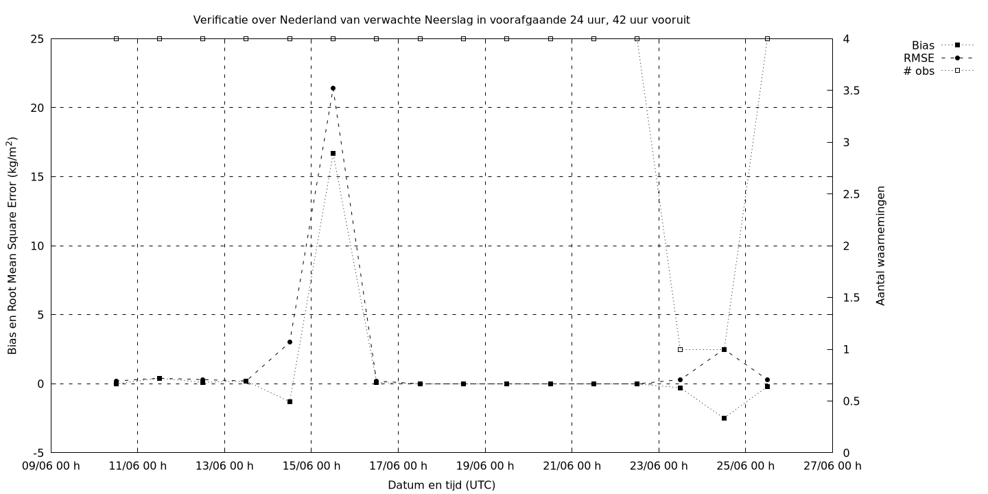 Met het gebruik van het 0,05x0,05 graads HIRLAM (5,5 km) kunnen we iets beters doen, namelijk een gebied van roostervierkanten nemen als representatief voor een waterschap. Dit maakt het mogelijk de spreiding van verwachtingswaarden in het waterschap mee te wegen in de op te stellen verwachting. Voor een waterschap is dat een 5x5 gebied van roostervierkanten, voor een stad 3x3 en voor een locatie (meetmast Cabauw) ook een gebied van 3x3 roostervierkanten (dit laatste voornamelijk om het weer in de omgeving van de mast in beeld te brengen).