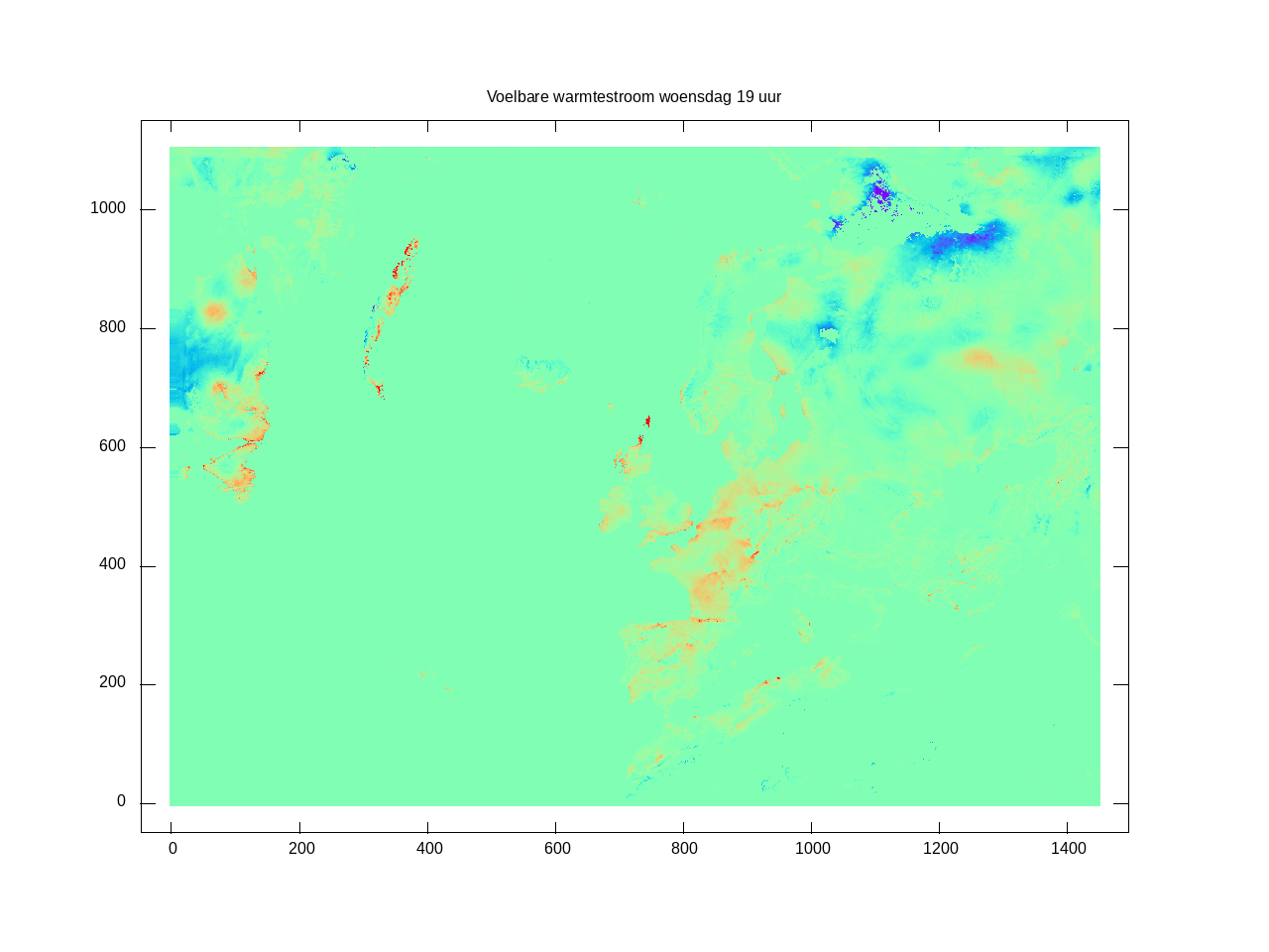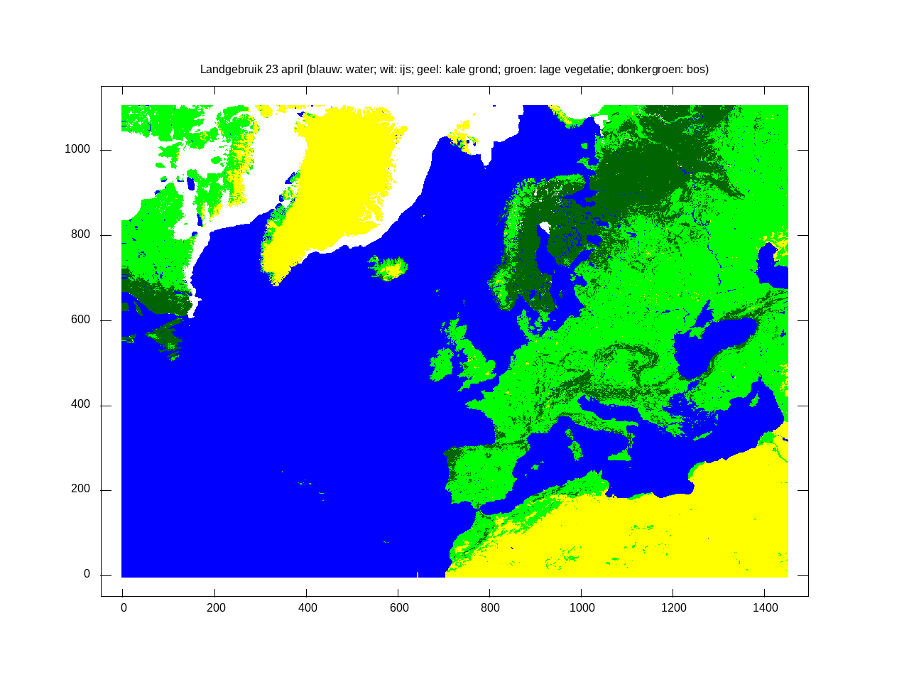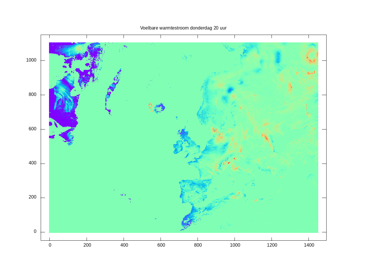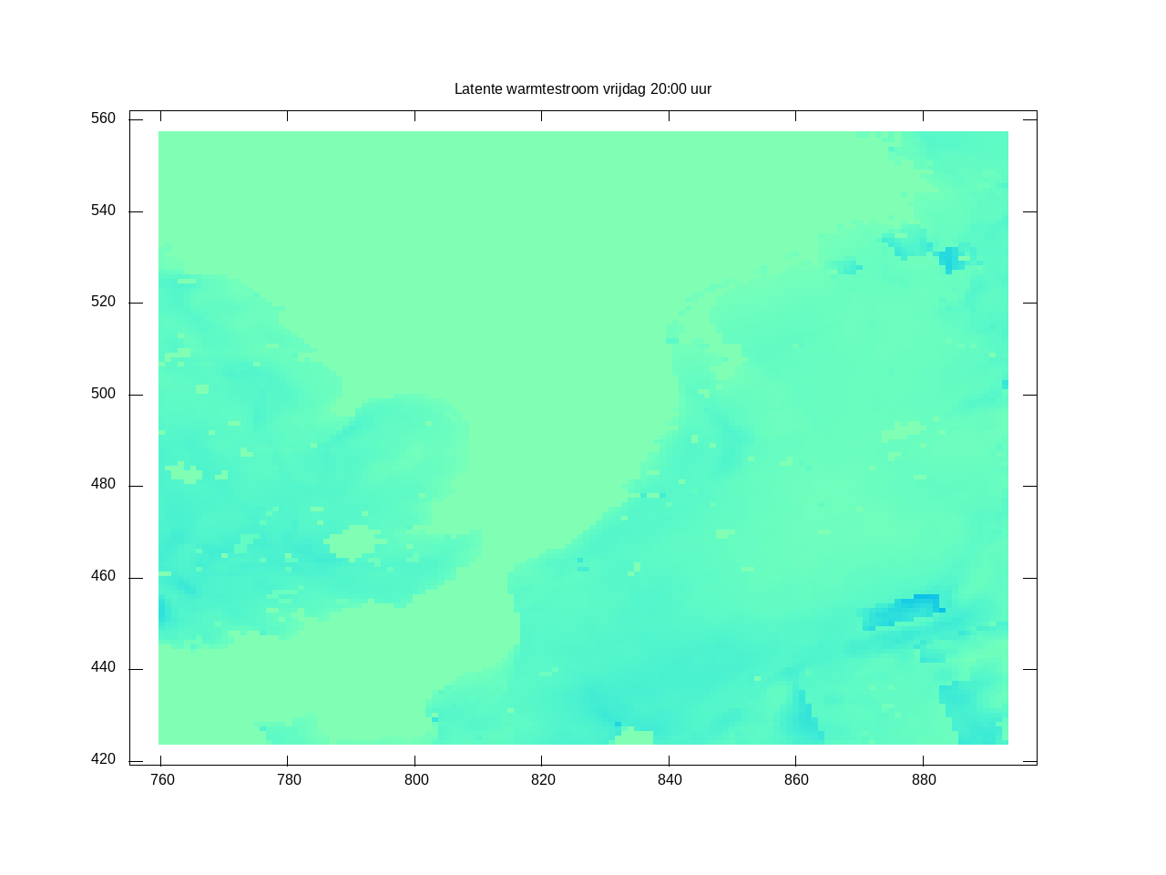 Het rekengebied: Land/zee kaart (om uit te vergroten) [hoe deze te maken]. Hoogtekaart (om uit te vergroten) [hoe deze te maken]; de kleurstelling in deze kaart wordt bepaald door het cubehelix algoritme. Hulpmiddelen: LONLAT.def en getfield.