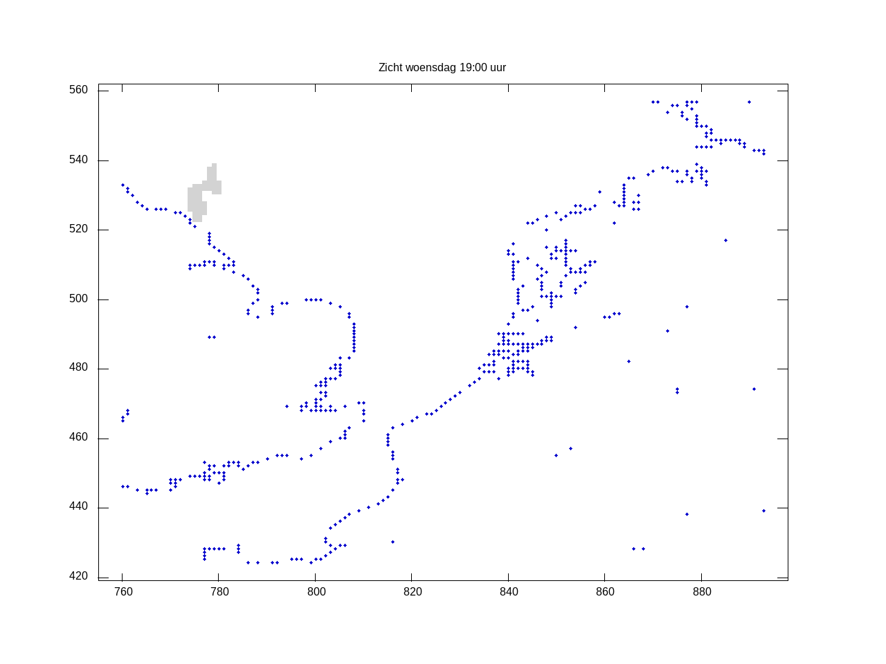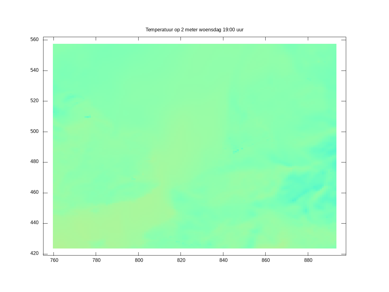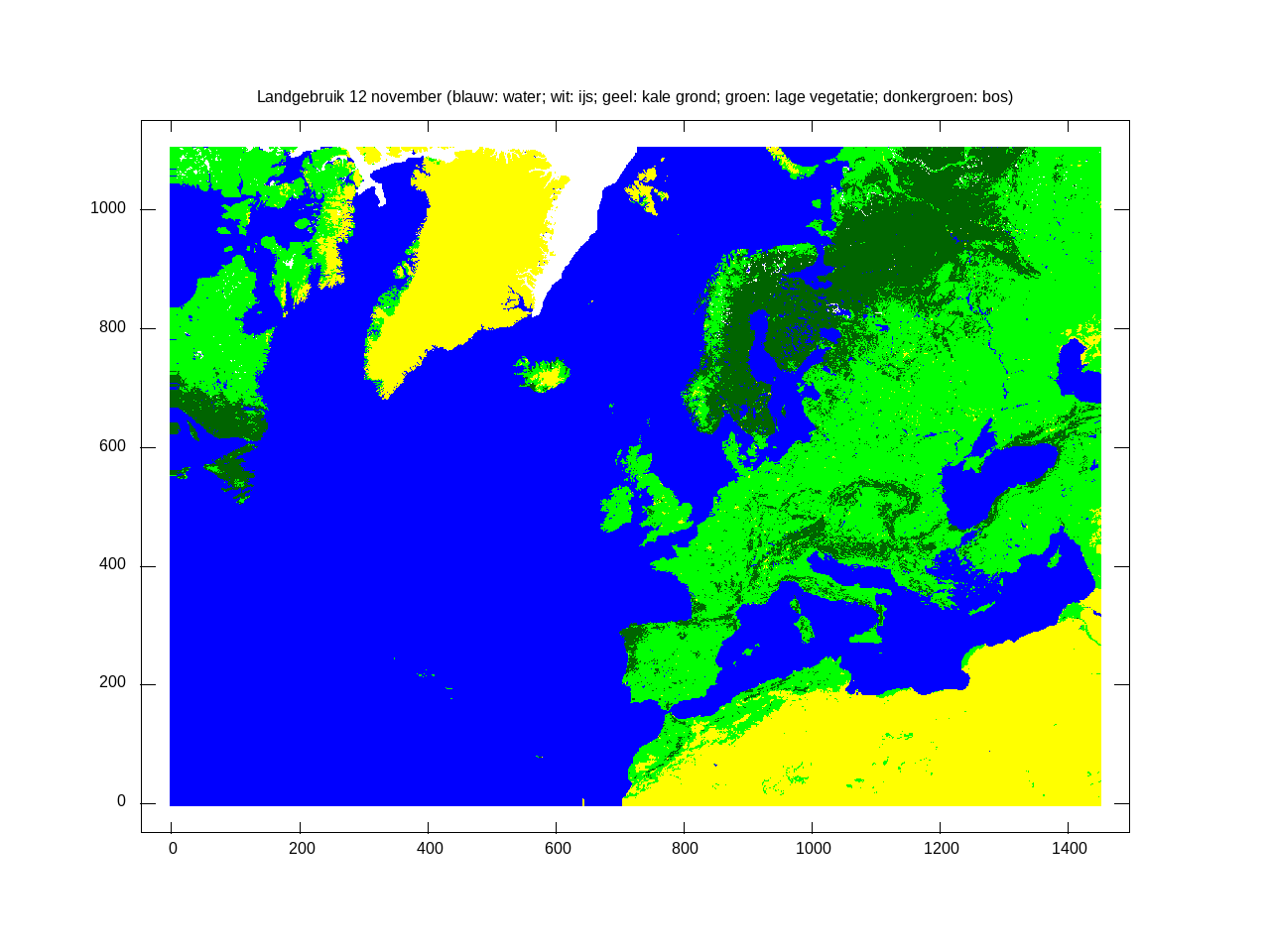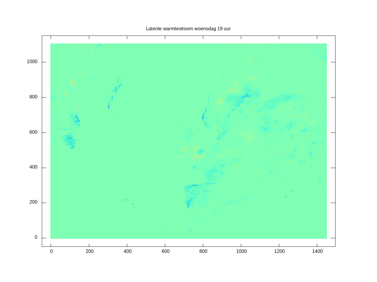 Het rekengebied: Land/zee kaart (om uit te vergroten) [hoe deze te maken]. Hoogtekaart (om uit te vergroten) [hoe deze te maken]; de kleurstelling in deze kaart wordt bepaald door het cubehelix algoritme. Hulpmiddelen: LONLAT.def en getfield.