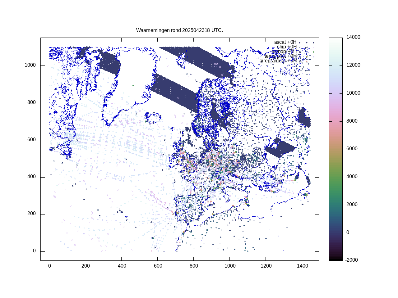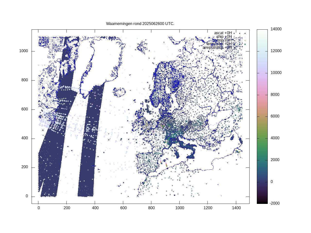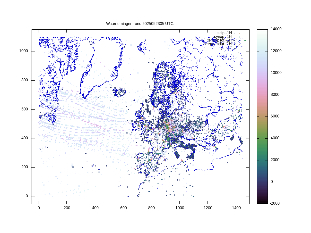 Dan volgt een tabel met de tekstuele uitvoer van de berekeningen die nodig zijn om de vier-maal-daagse aanpassing van de atmosferische gesteldheid te maken, alsmede kaarten van de verwerkte waarnemingen.