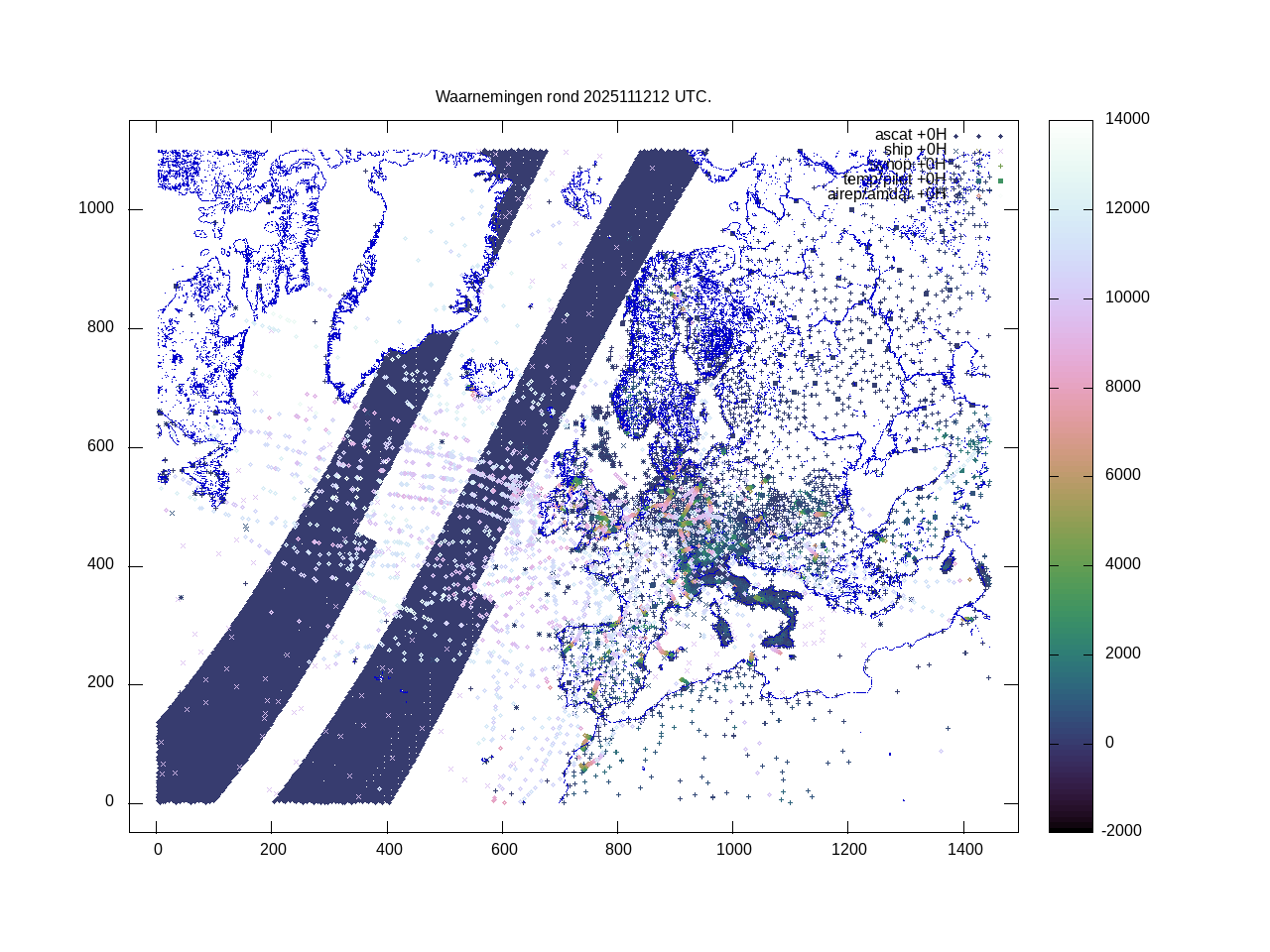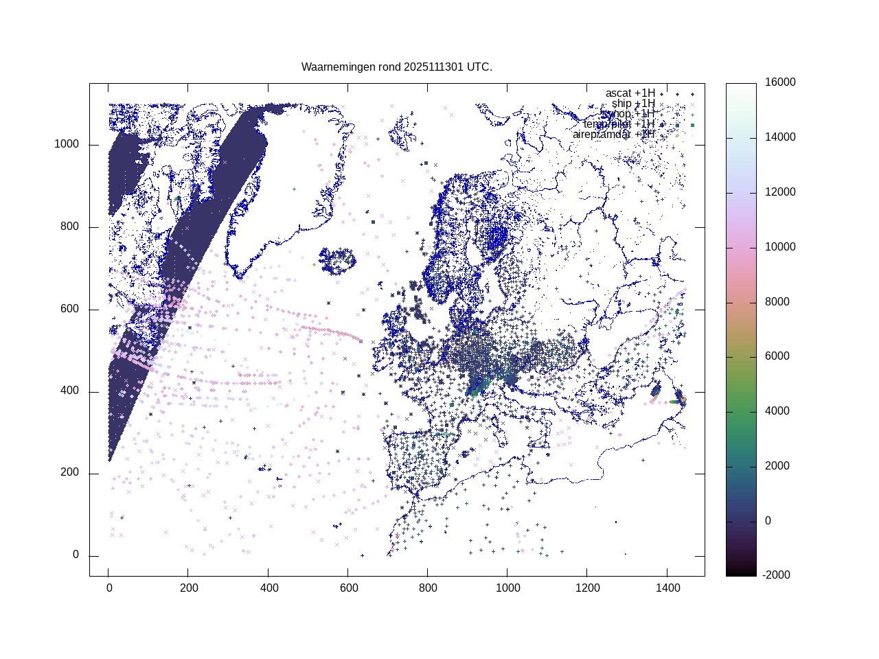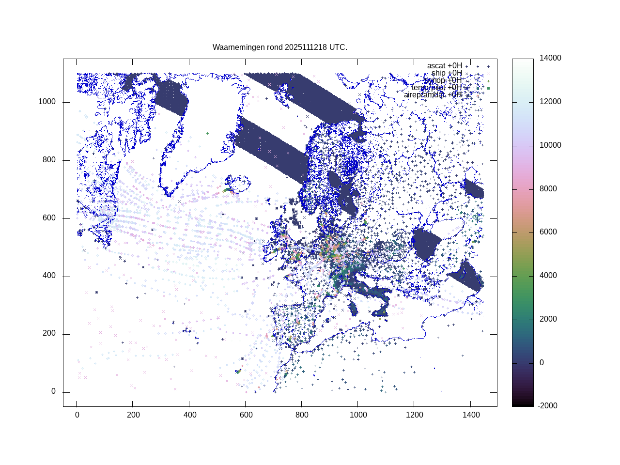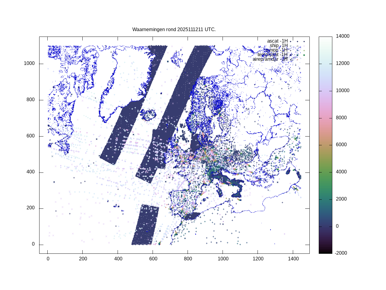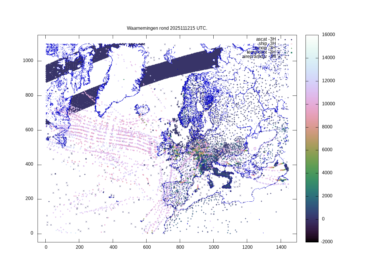 De ingekomen waarnemingen zijn gekleurd naar hoogte volgens het cubehelix algoritme. De verwerkte waarnemingen zijn gekleurd volgens de behandeling (gebruikt, redundant of verworpen).