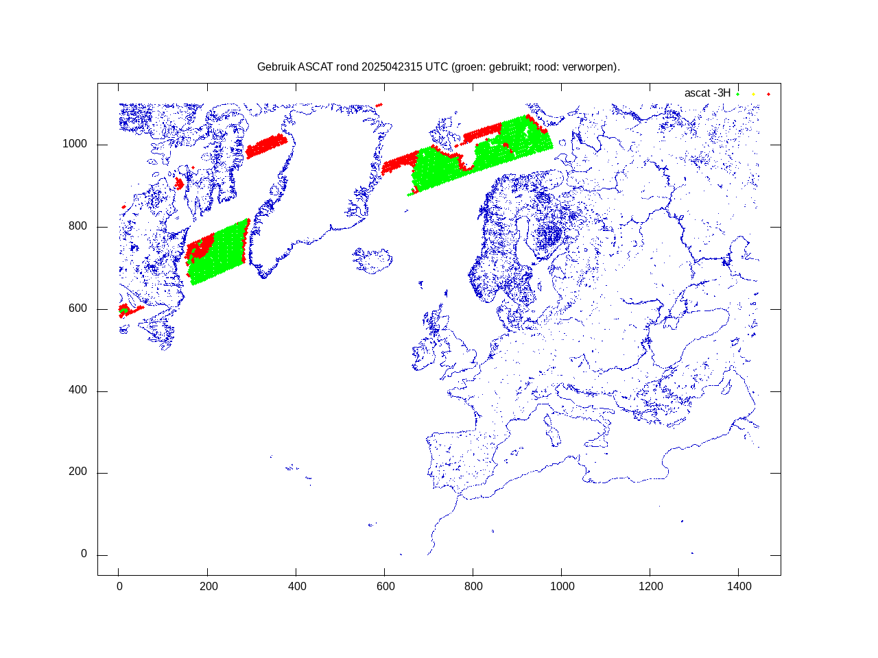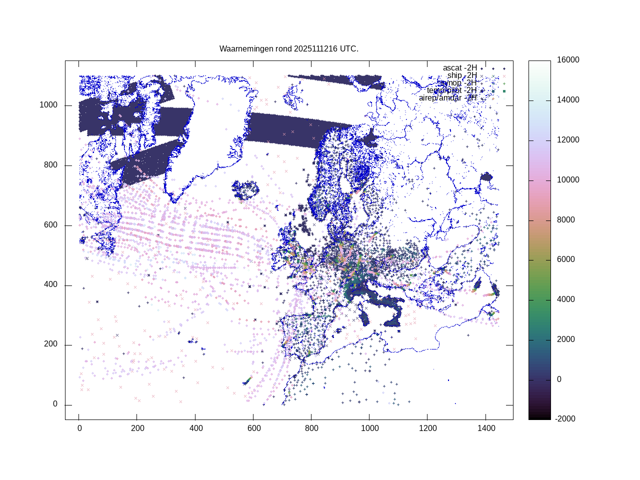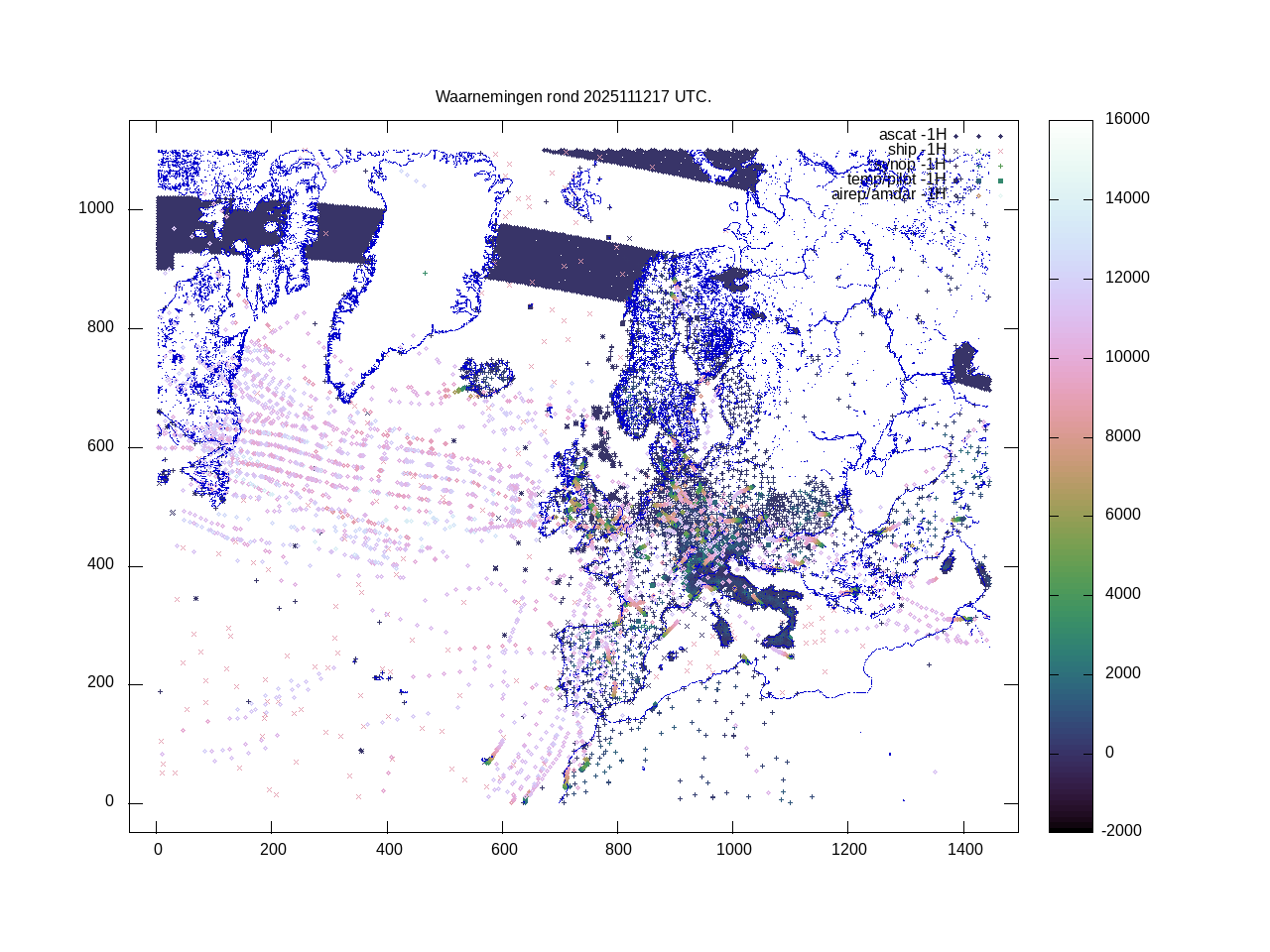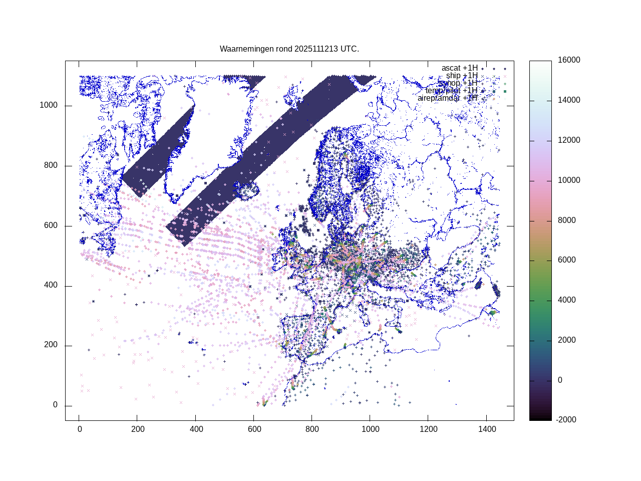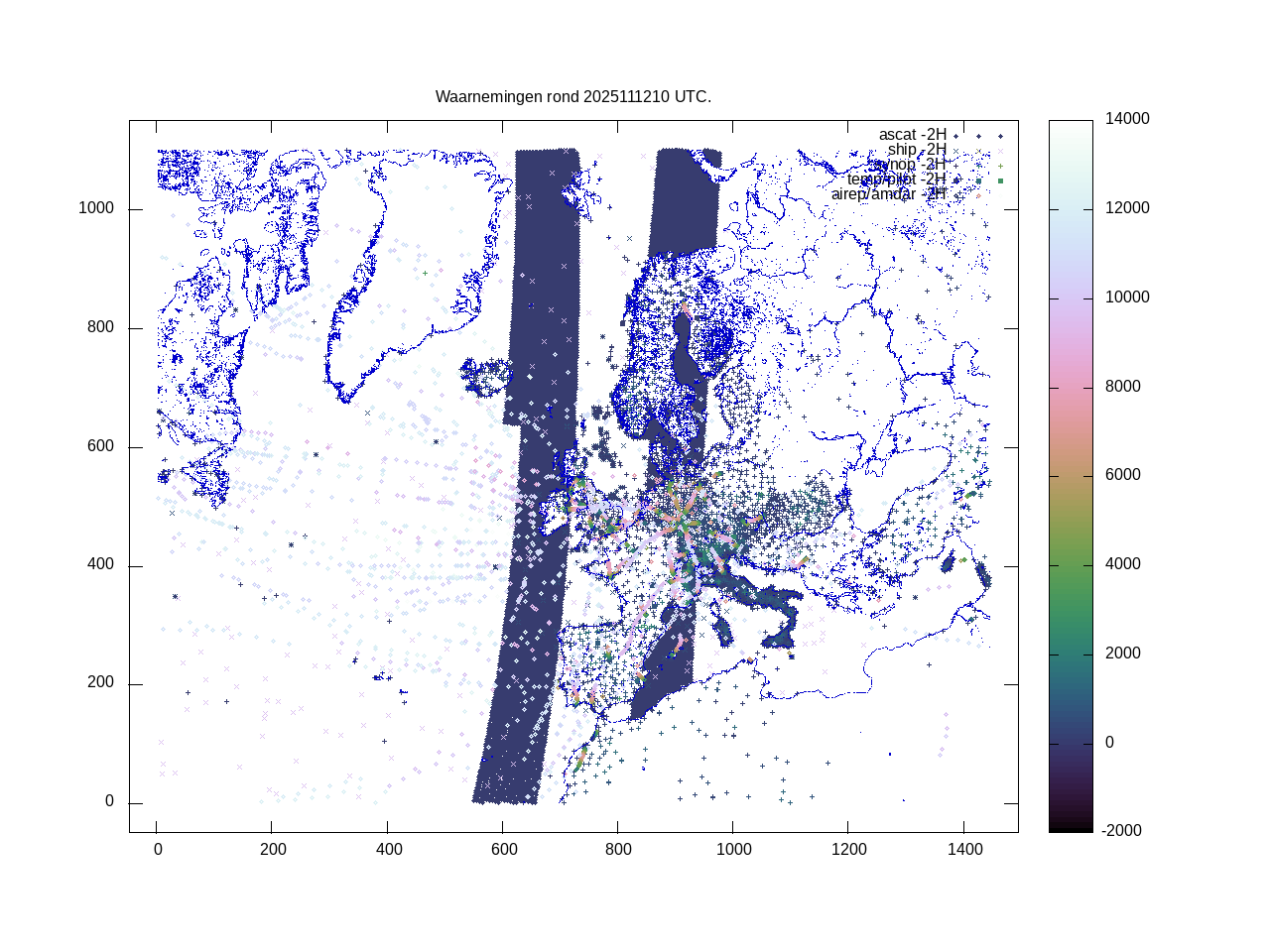 De ingekomen waarnemingen zijn gekleurd naar hoogte volgens het cubehelix algoritme. De verwerkte waarnemingen zijn gekleurd volgens de behandeling (gebruikt, redundant of verworpen).