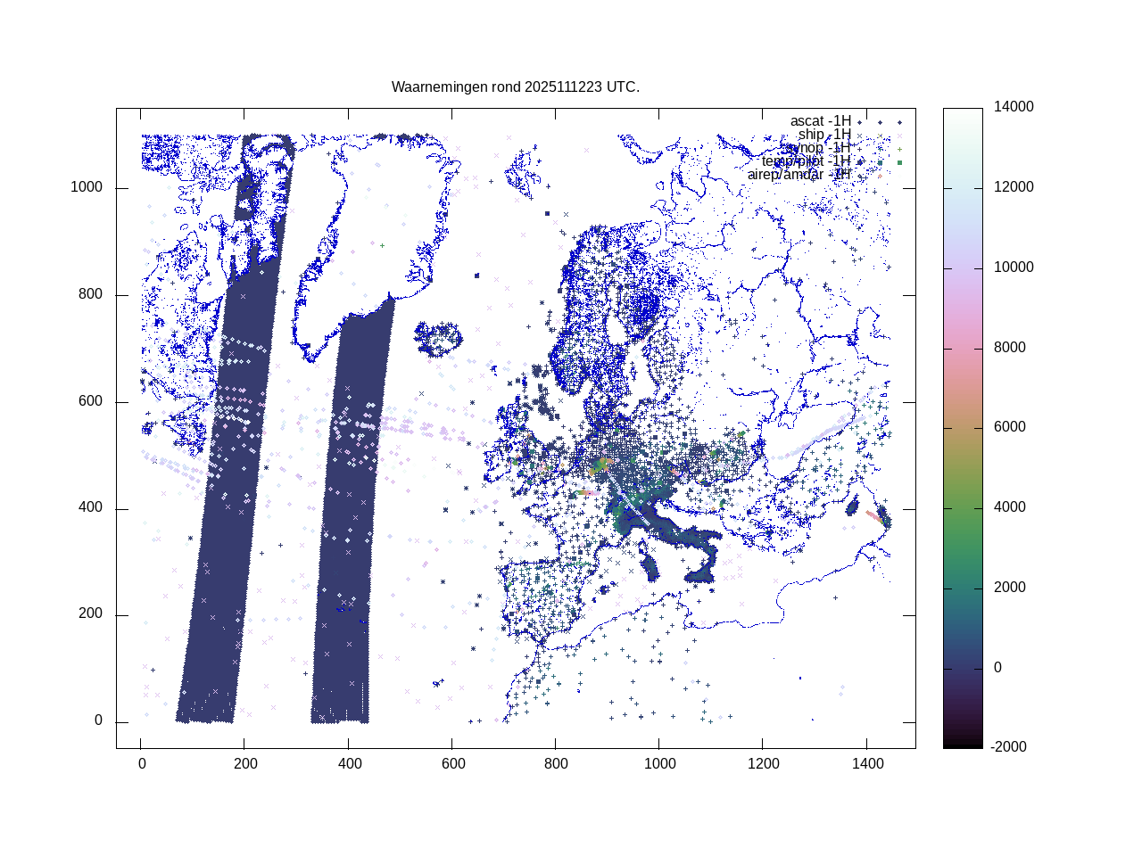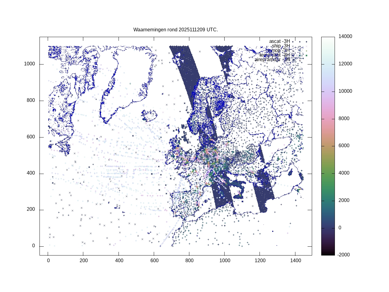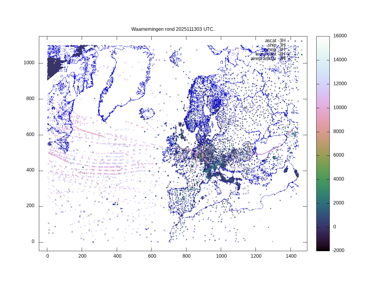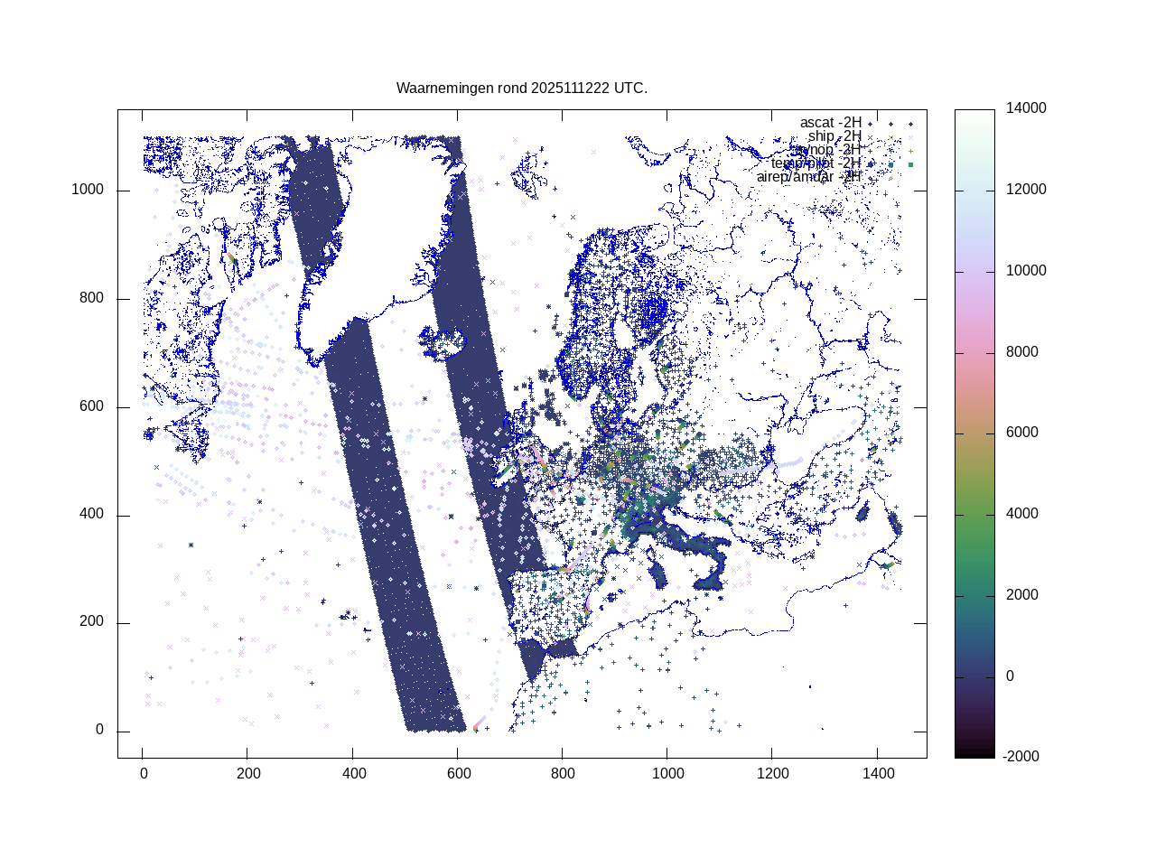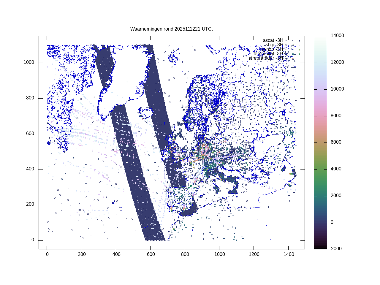 De ingekomen waarnemingen zijn gekleurd naar hoogte volgens het cubehelix algoritme. De verwerkte waarnemingen zijn gekleurd volgens de behandeling (gebruikt, redundant of verworpen).