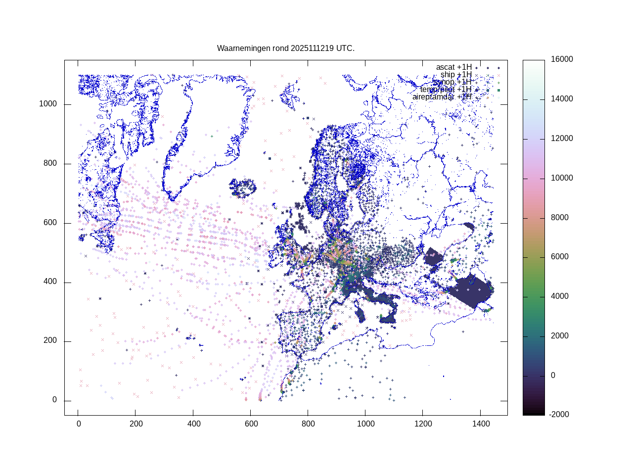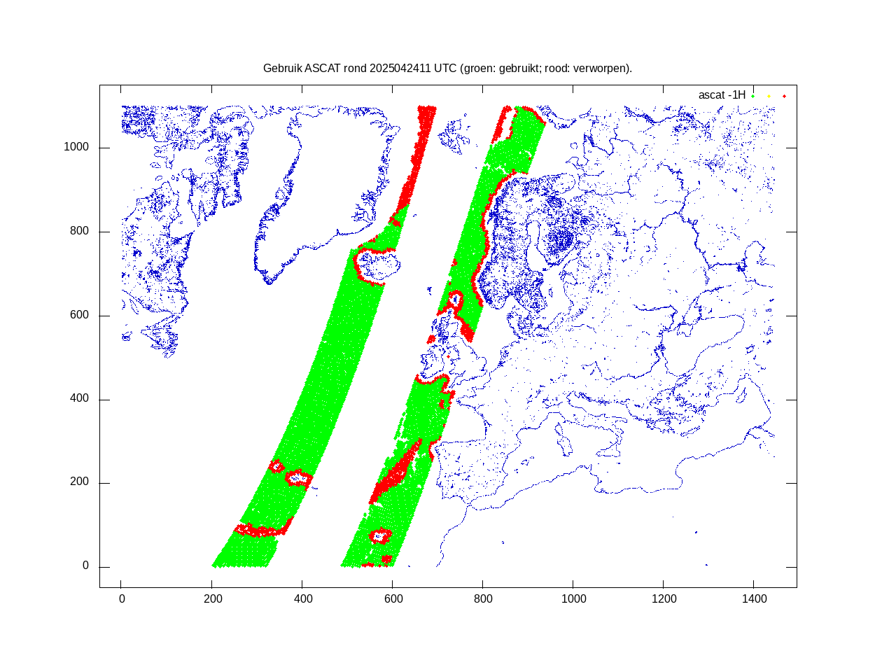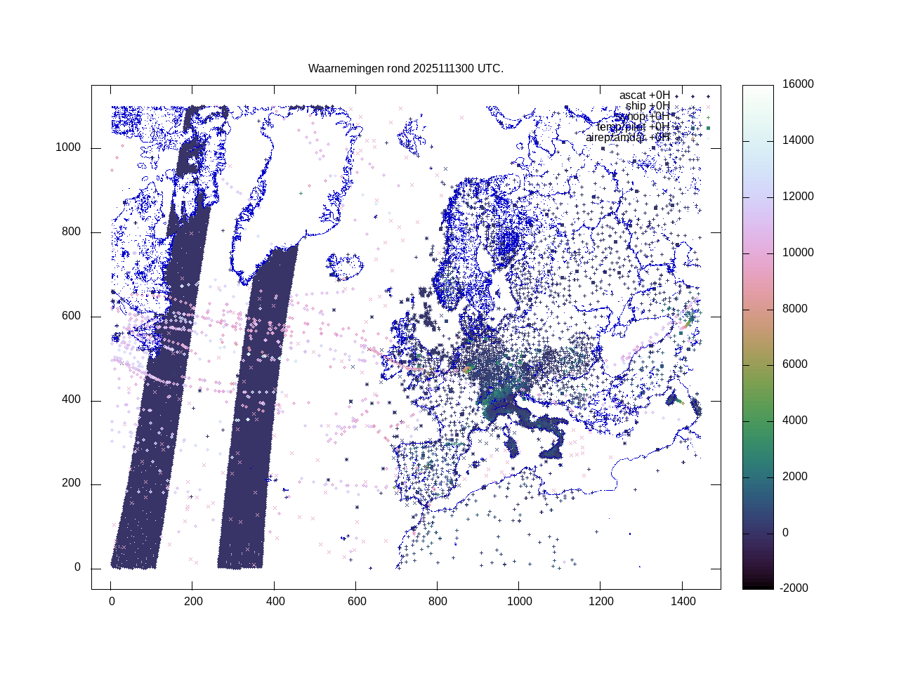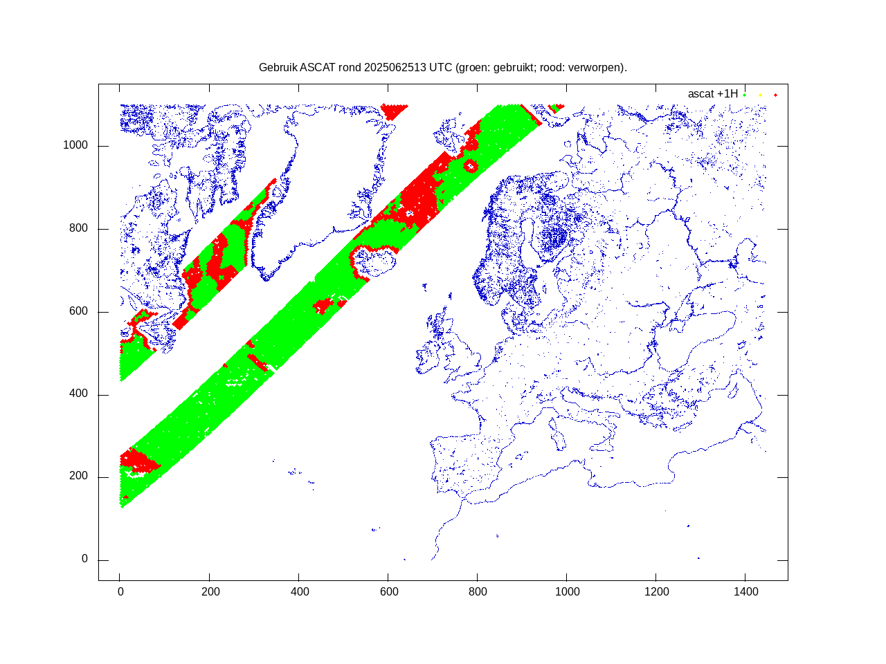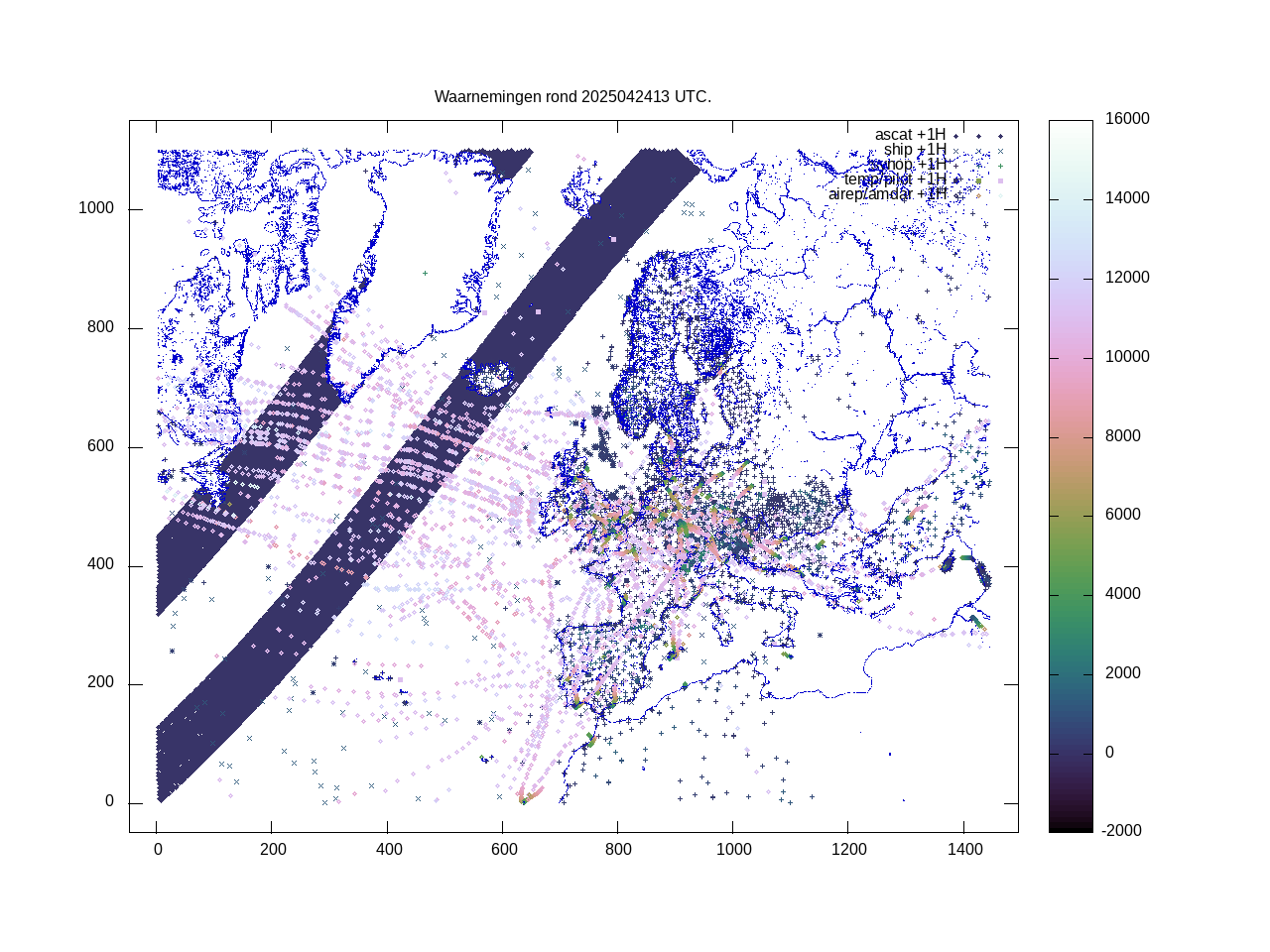 De ingekomen waarnemingen zijn gekleurd naar hoogte volgens het cubehelix algoritme. De verwerkte waarnemingen zijn gekleurd volgens de behandeling (gebruikt, redundant of verworpen).