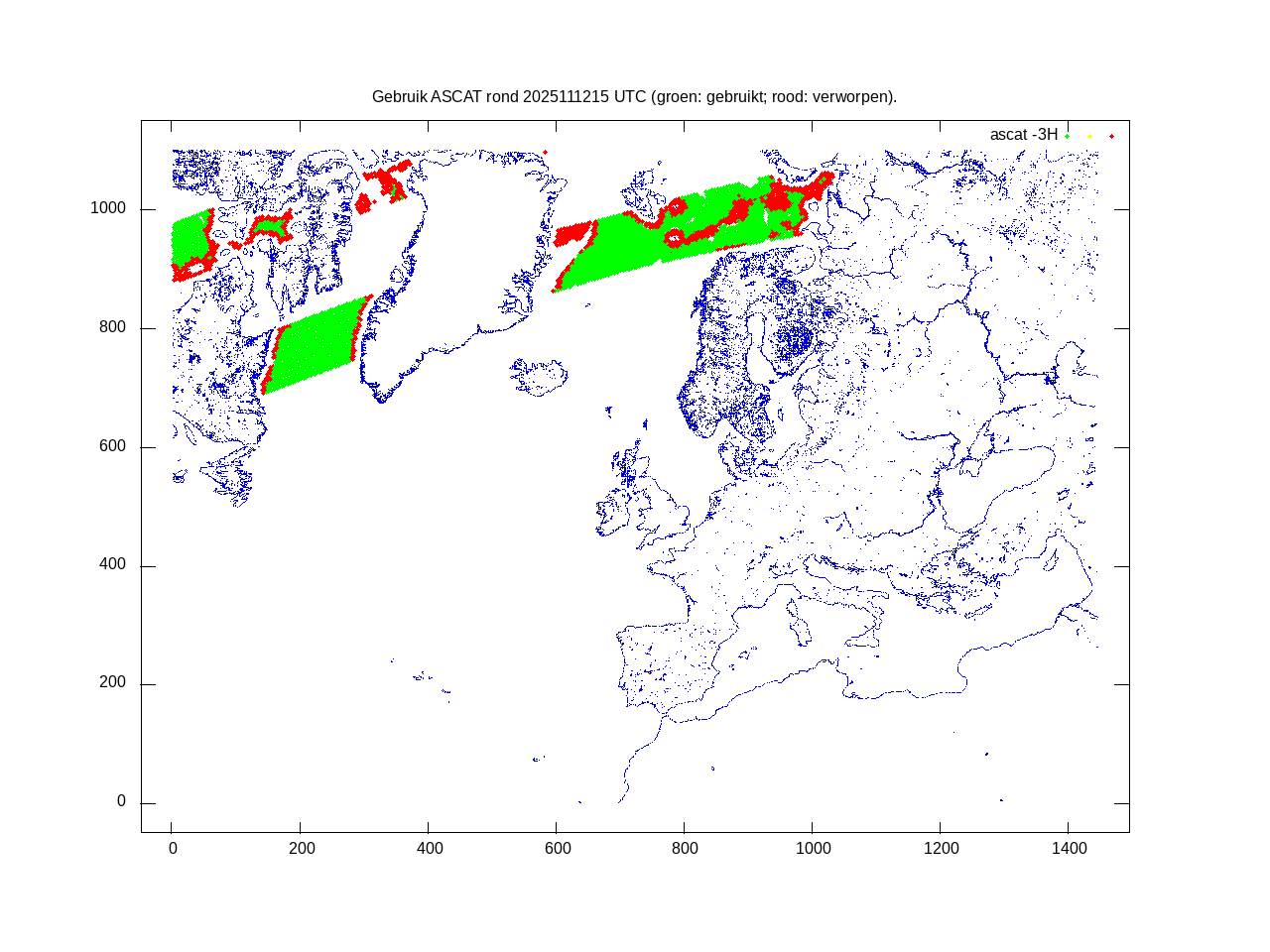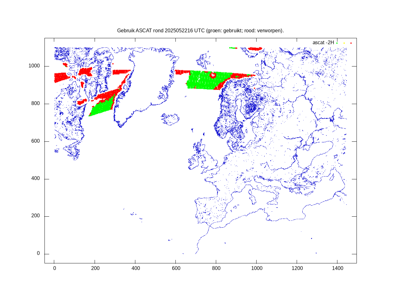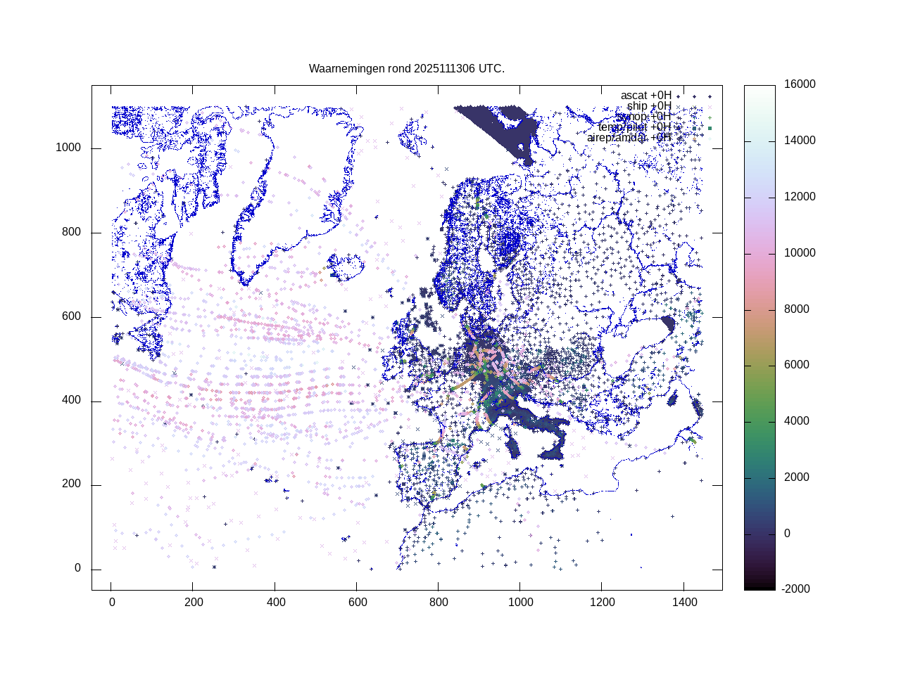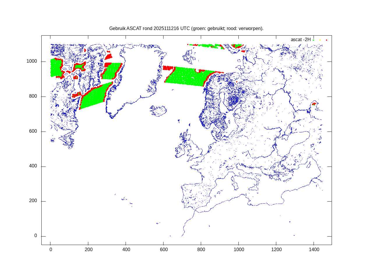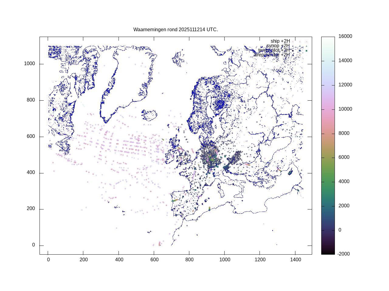De ingekomen waarnemingen zijn gekleurd naar hoogte volgens het cubehelix algoritme. De verwerkte waarnemingen zijn gekleurd volgens de behandeling (gebruikt, redundant of verworpen).