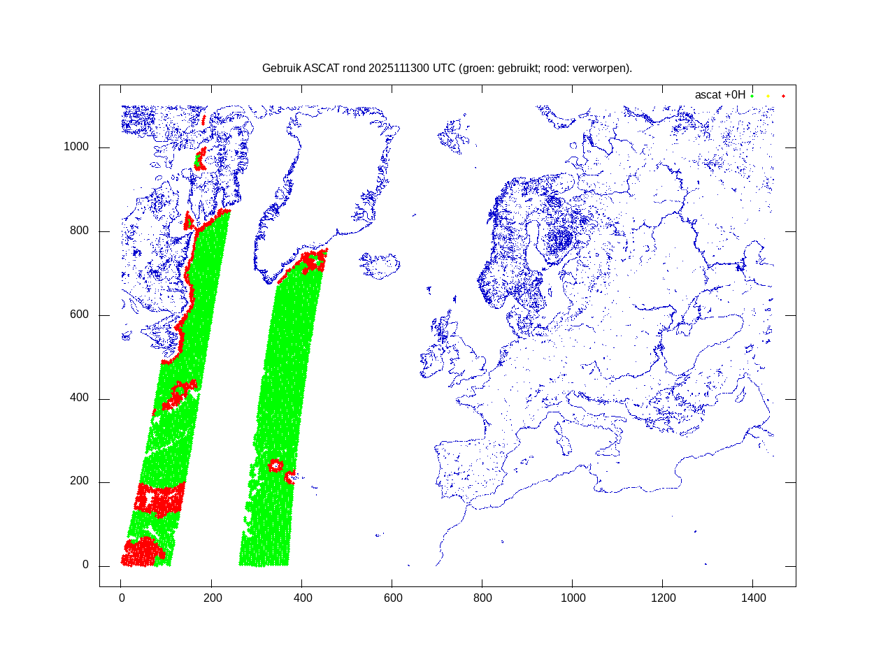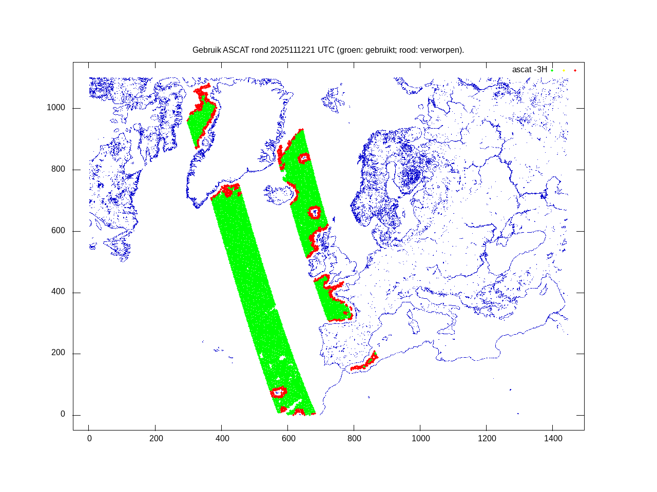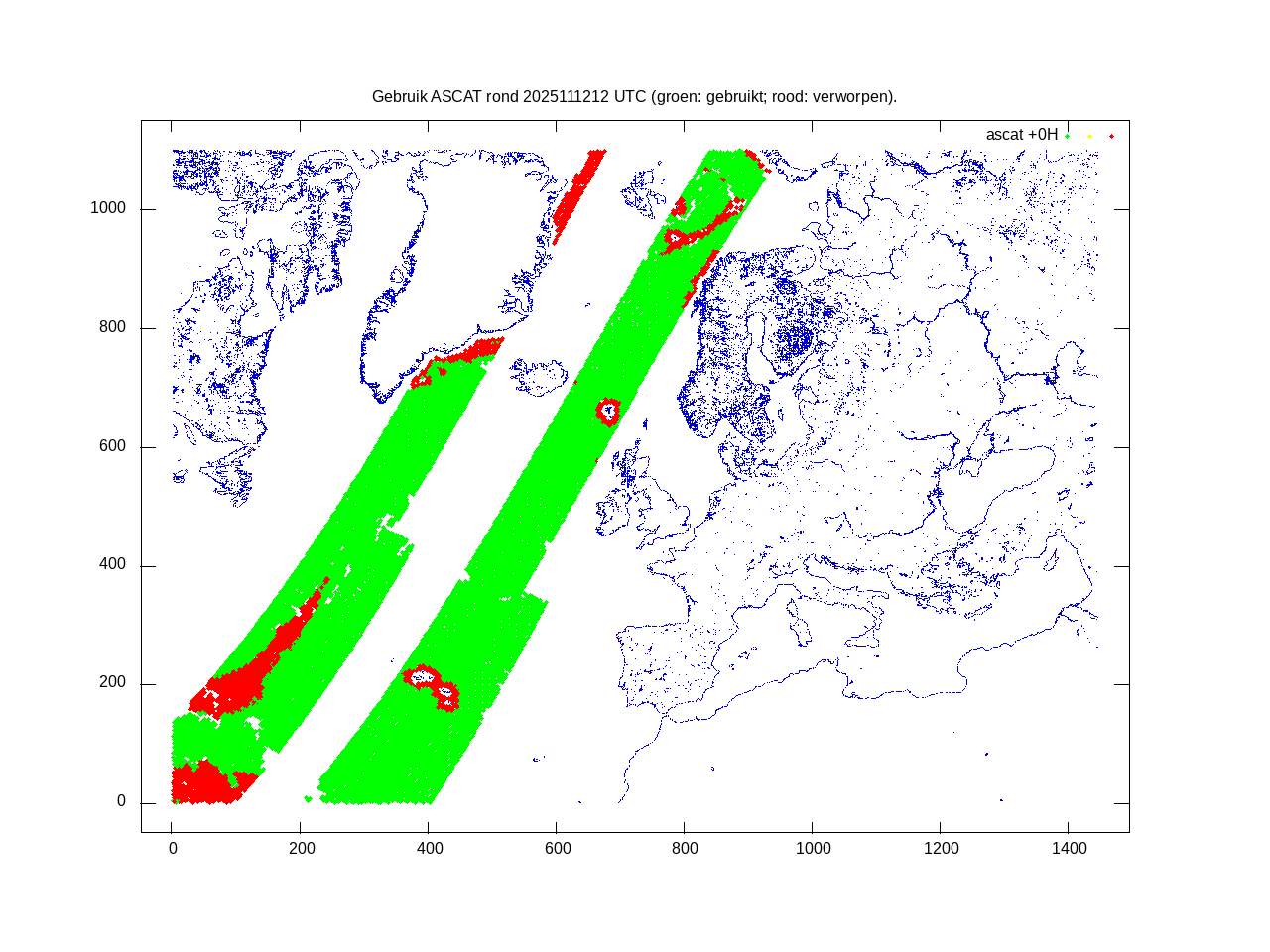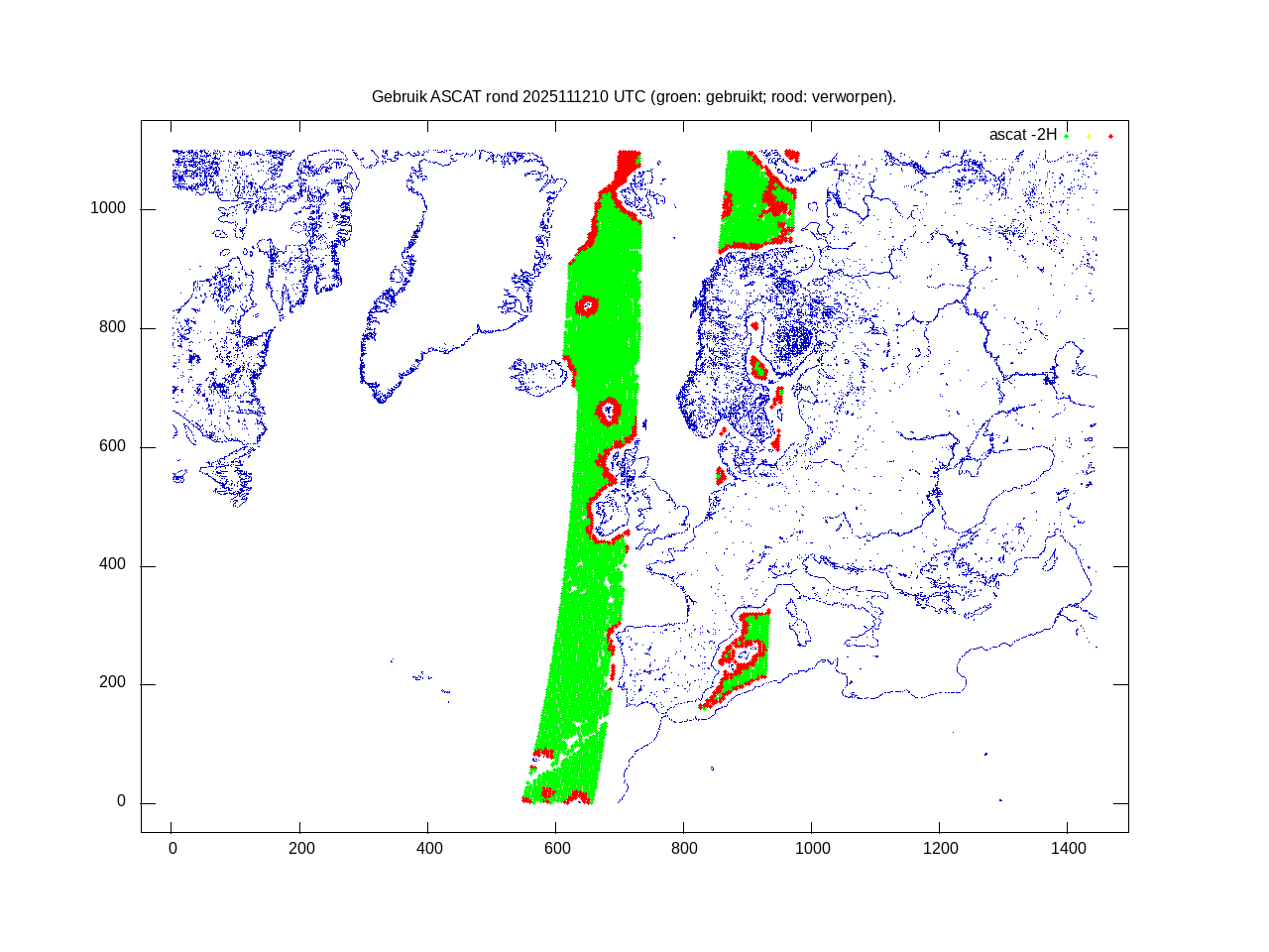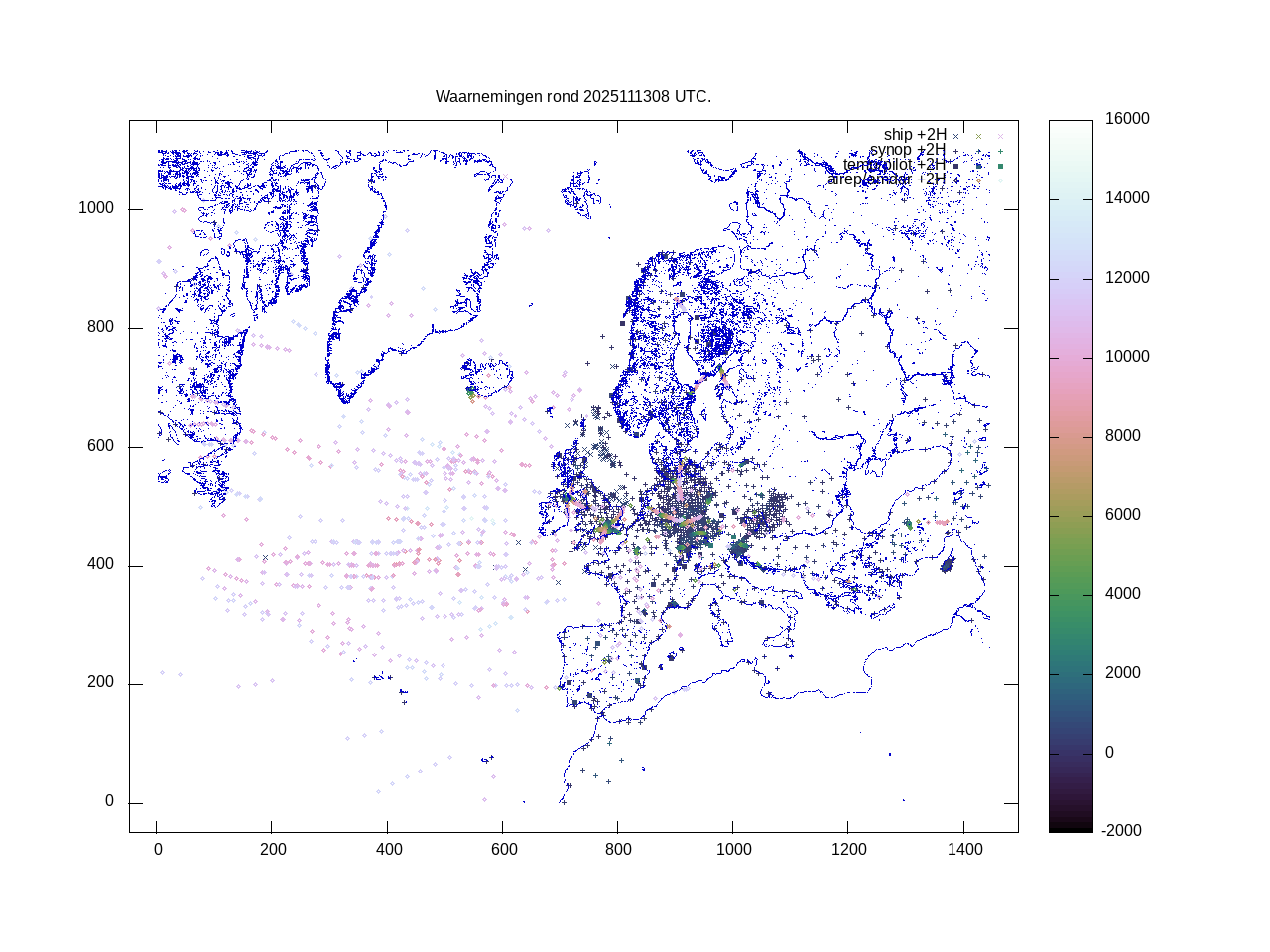 De ingekomen waarnemingen zijn gekleurd naar hoogte volgens het cubehelix algoritme. De verwerkte waarnemingen zijn gekleurd volgens de behandeling (gebruikt, redundant of verworpen).
