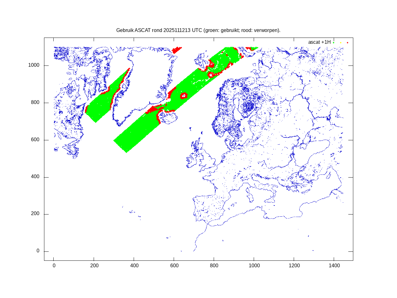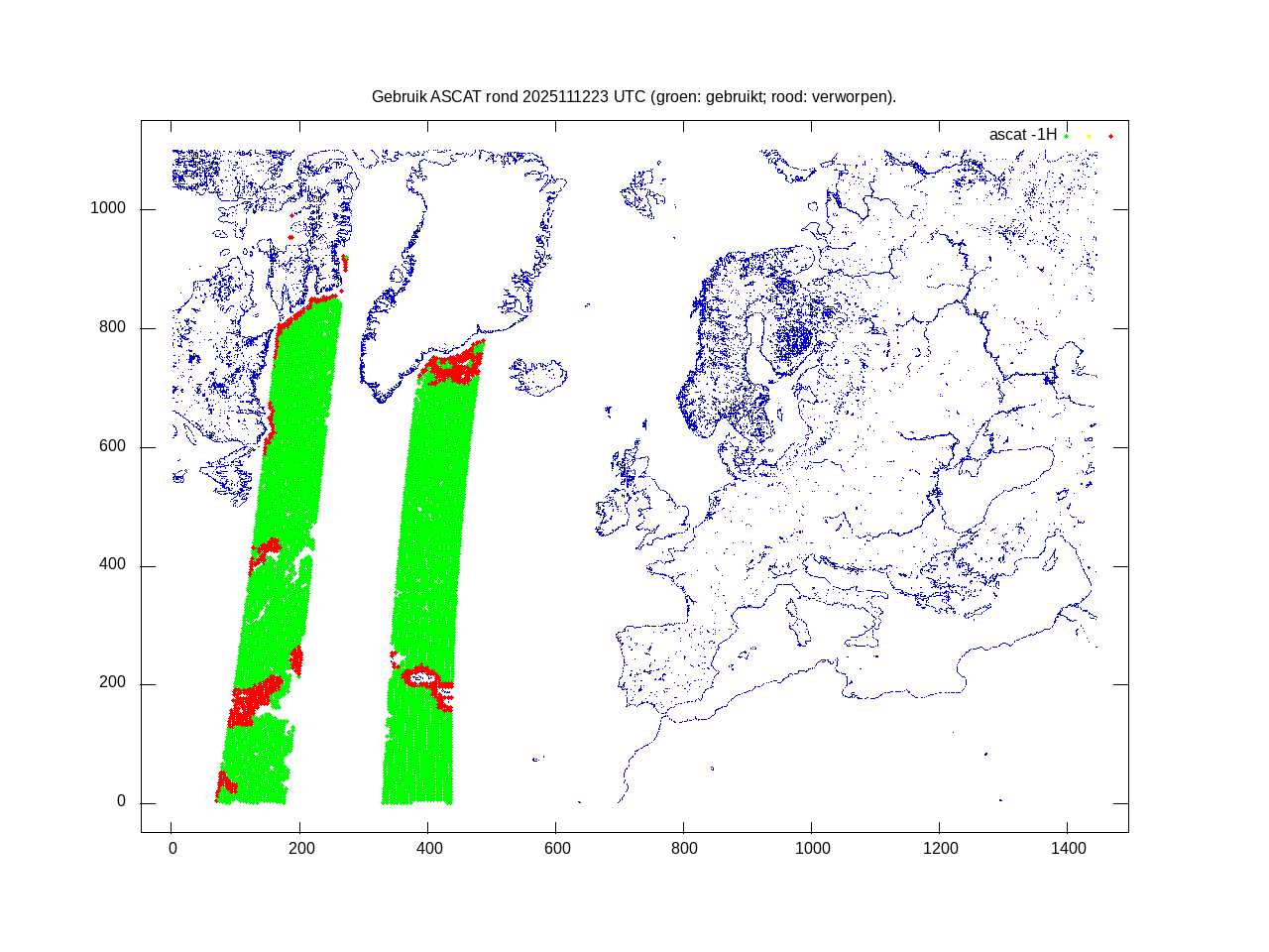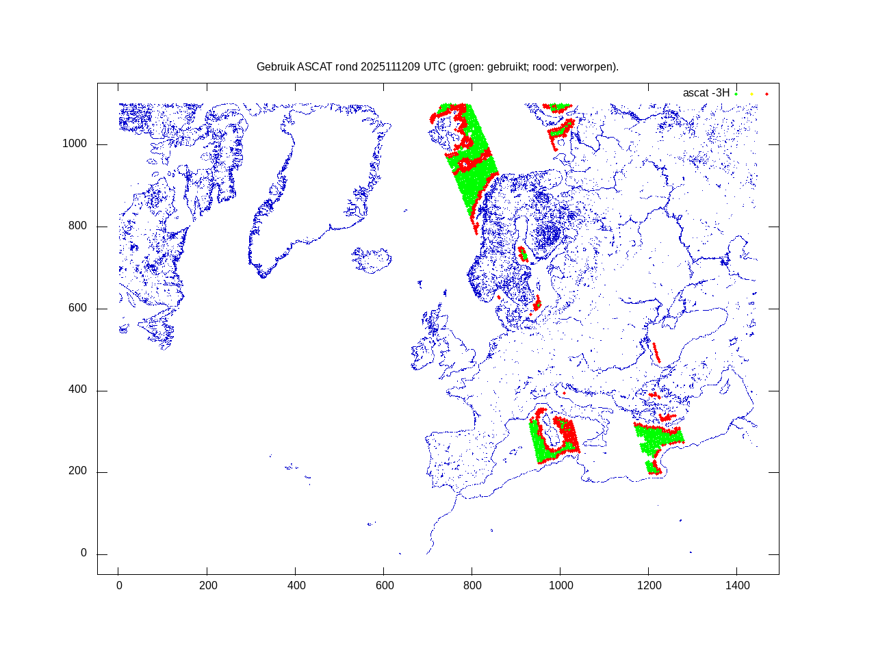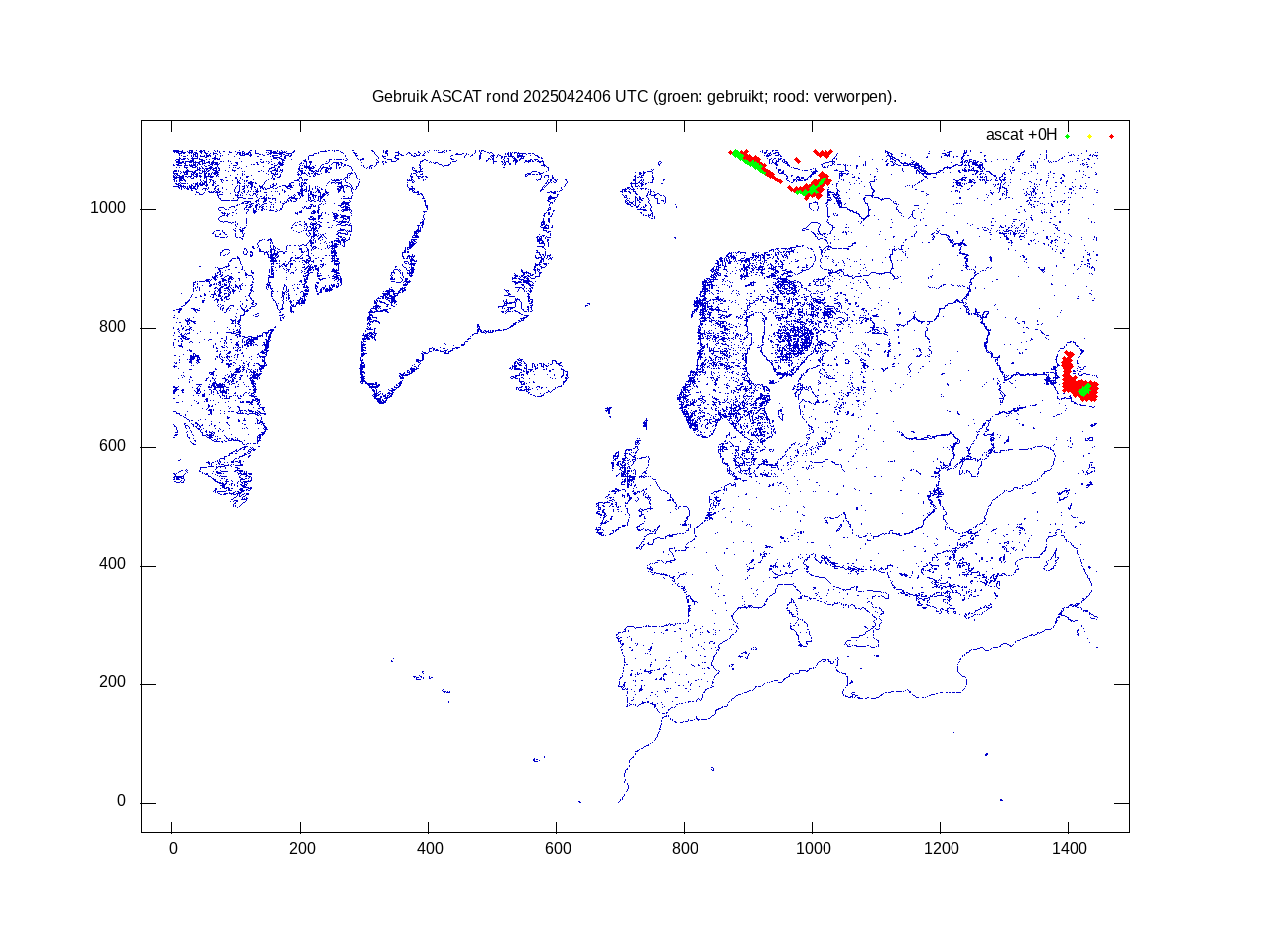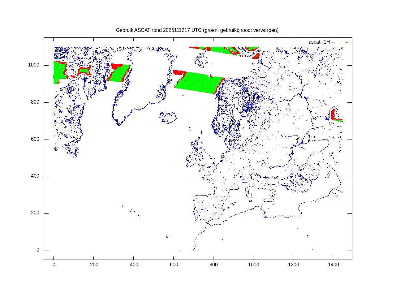 De ingekomen waarnemingen zijn gekleurd naar hoogte volgens het cubehelix algoritme. De verwerkte waarnemingen zijn gekleurd volgens de behandeling (gebruikt, redundant of verworpen).