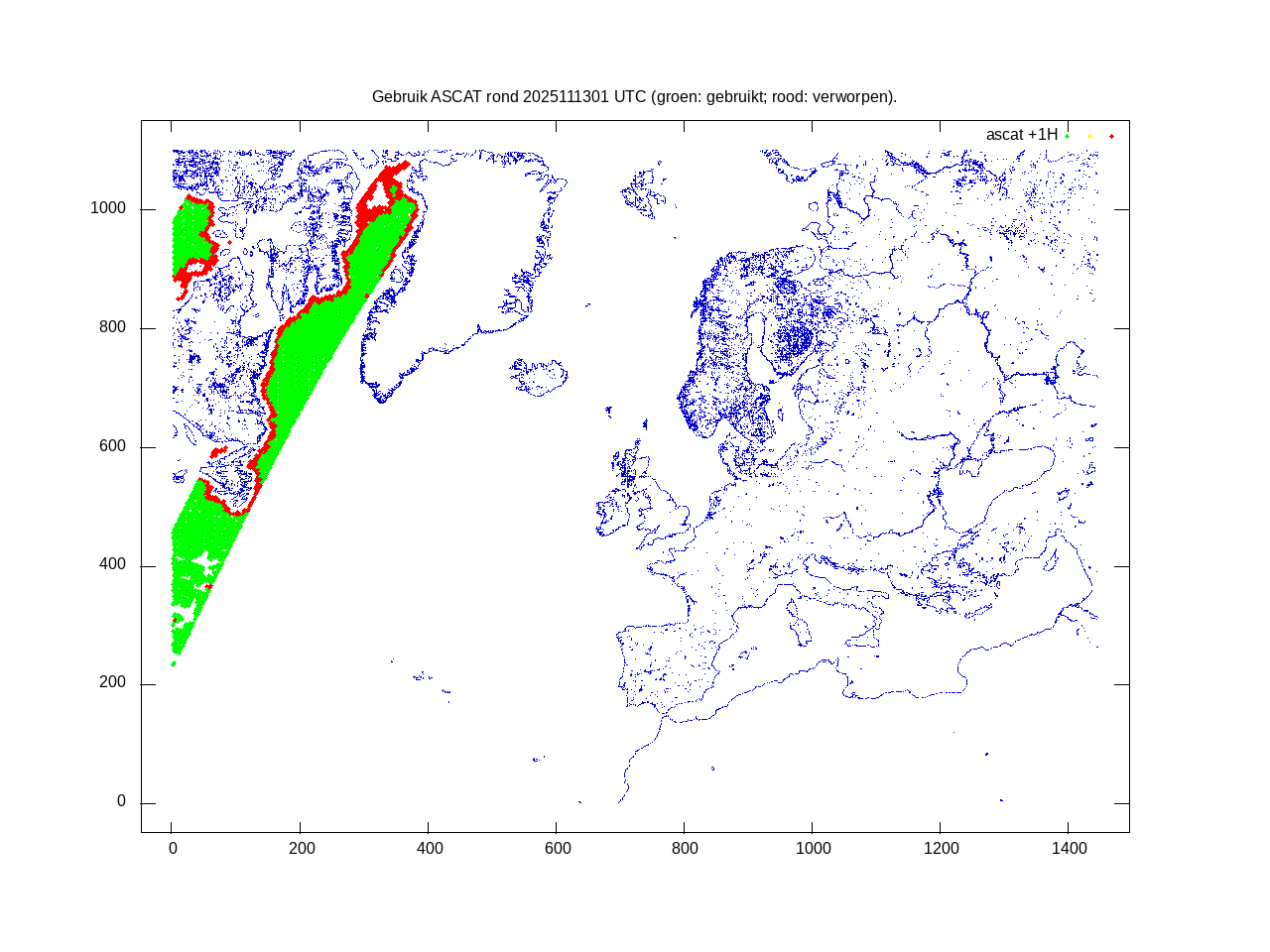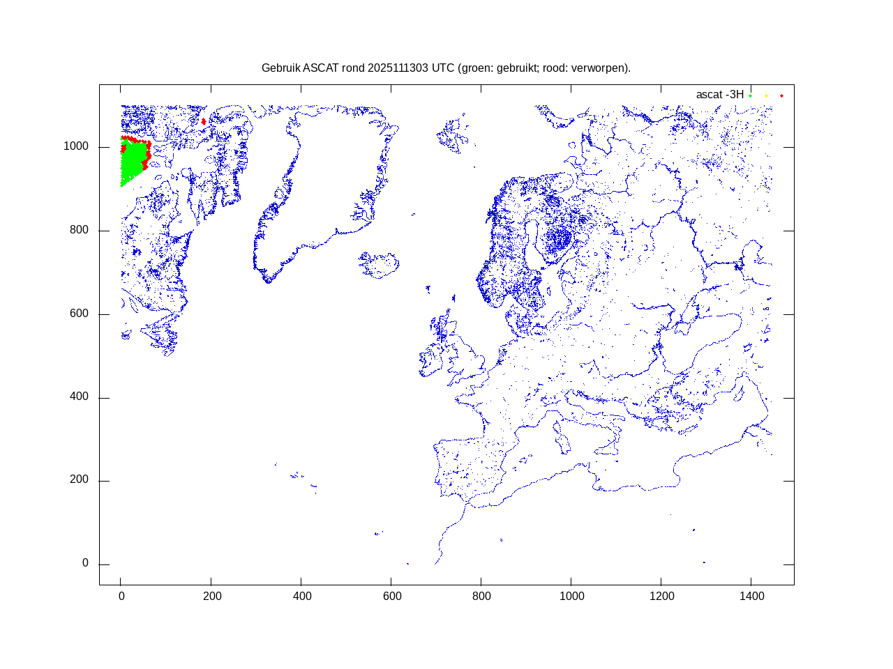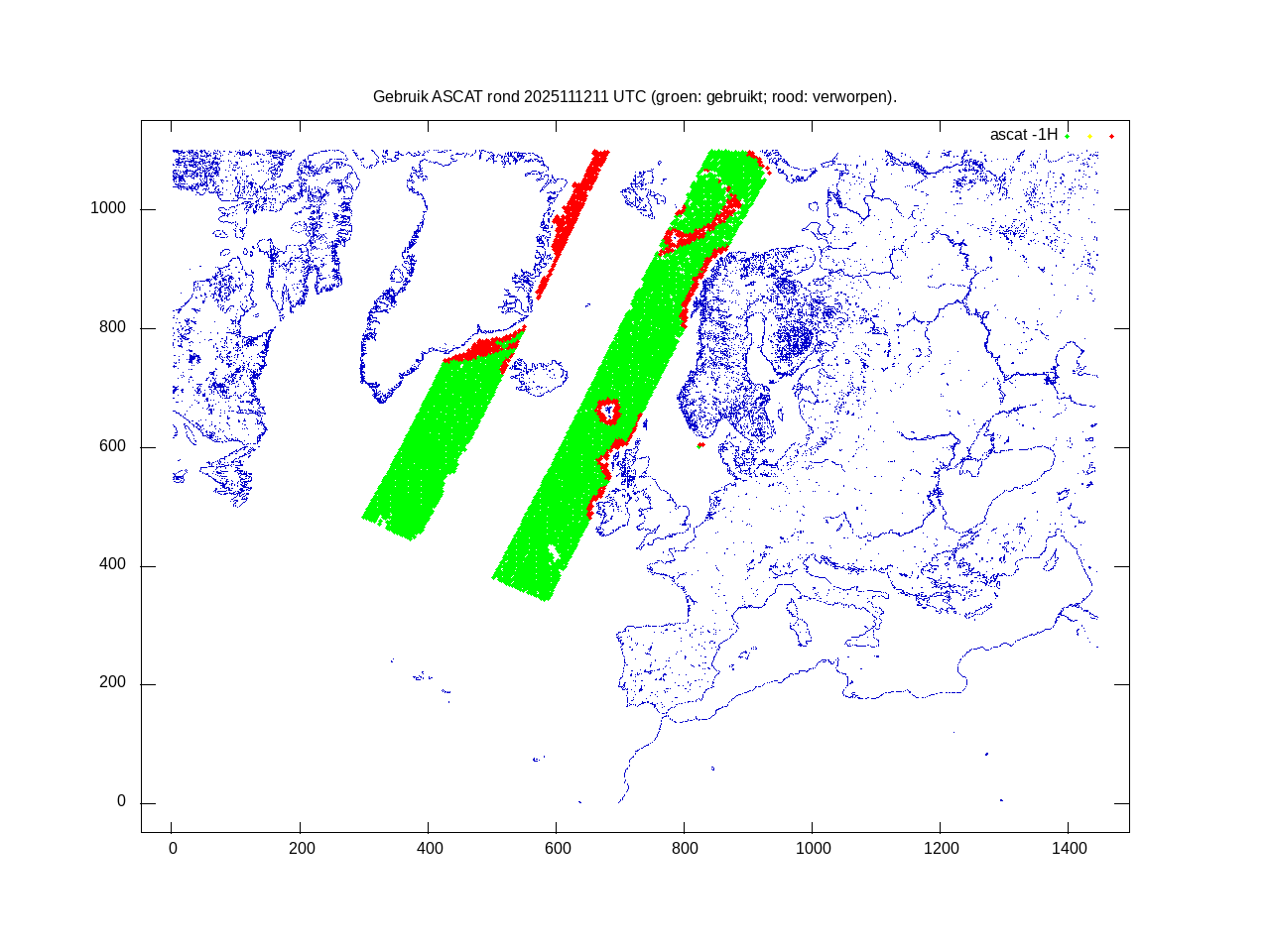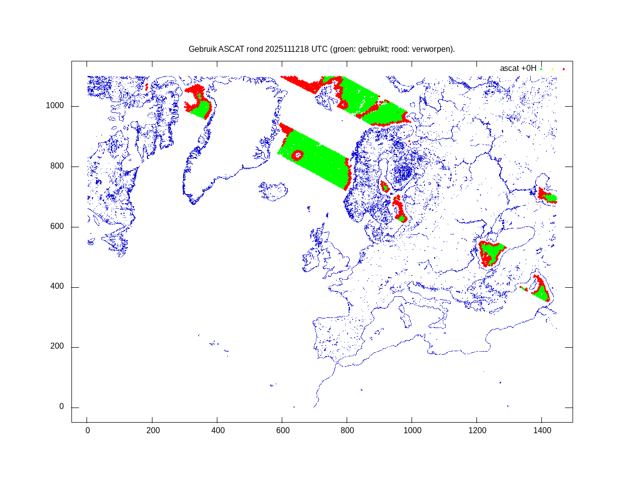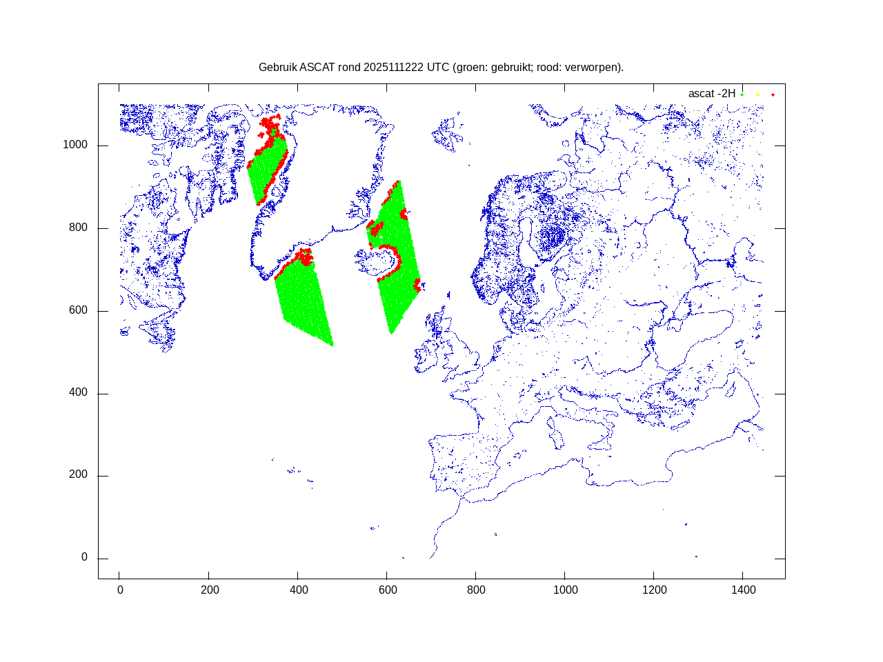 De ingekomen waarnemingen zijn gekleurd naar hoogte volgens het cubehelix algoritme. De verwerkte waarnemingen zijn gekleurd volgens de behandeling (gebruikt, redundant of verworpen).