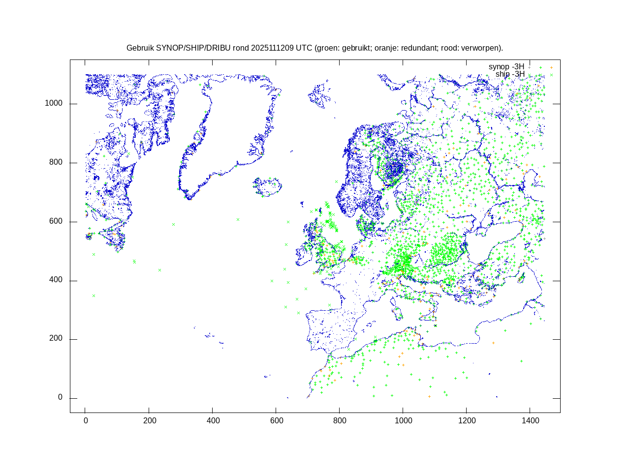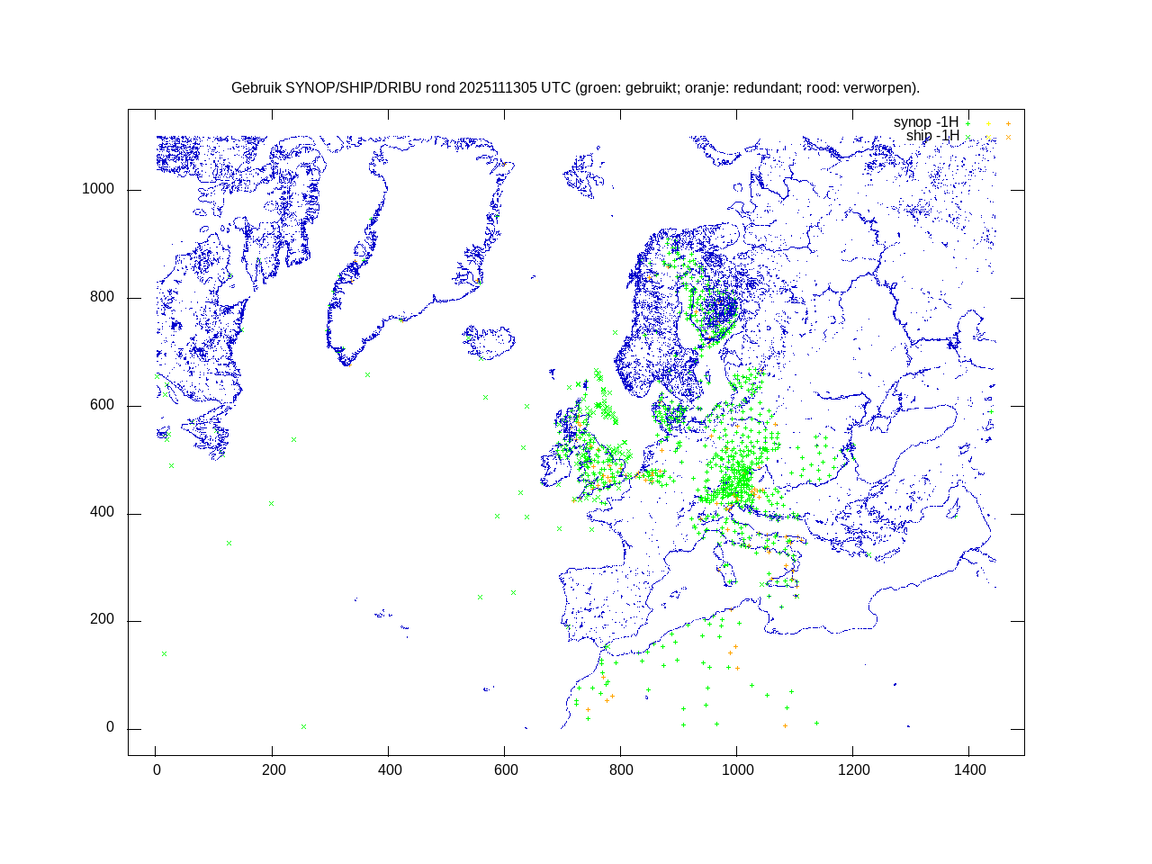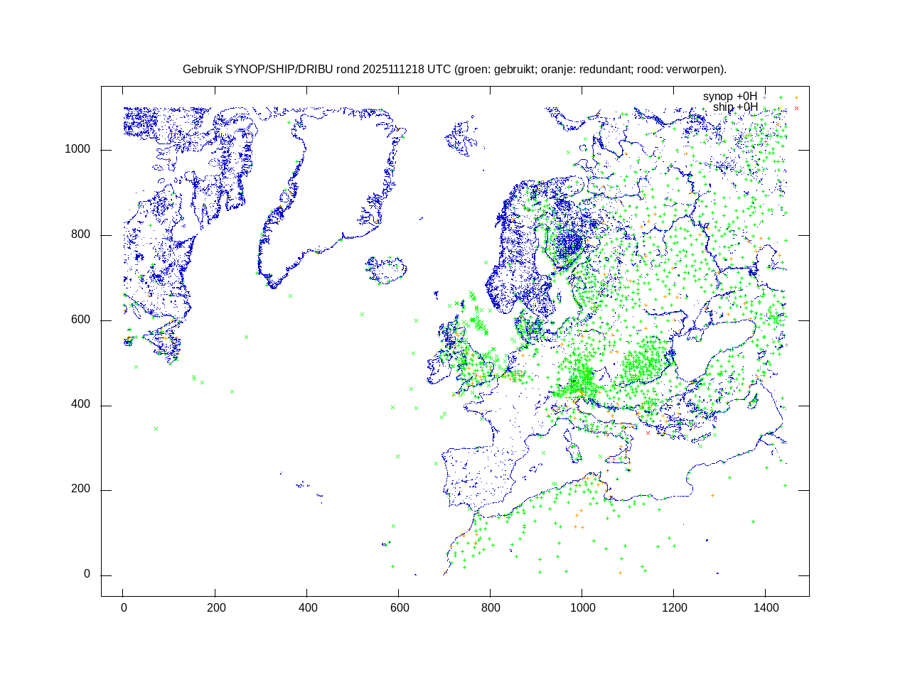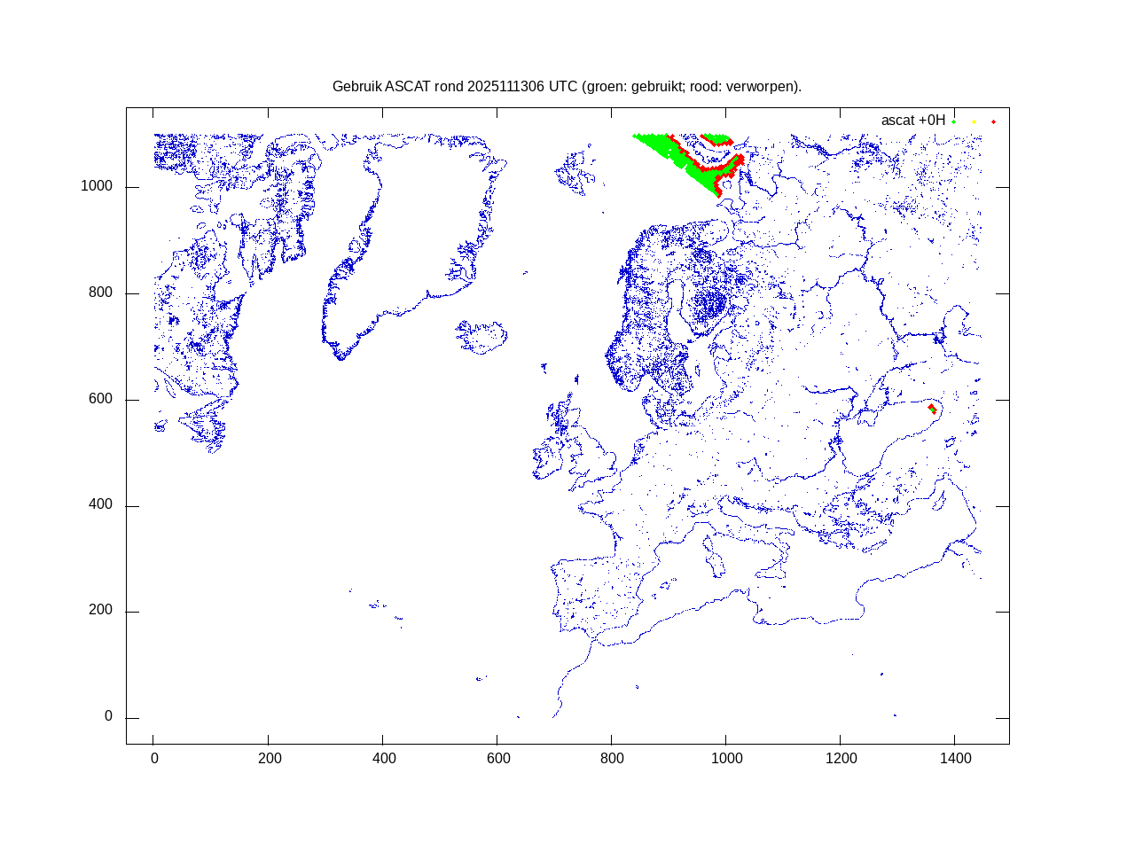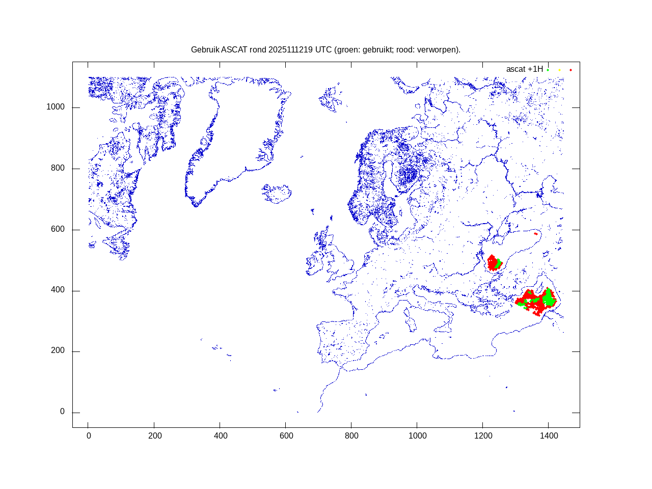 De ingekomen waarnemingen zijn gekleurd naar hoogte volgens het cubehelix algoritme. De verwerkte waarnemingen zijn gekleurd volgens de behandeling (gebruikt, redundant of verworpen).